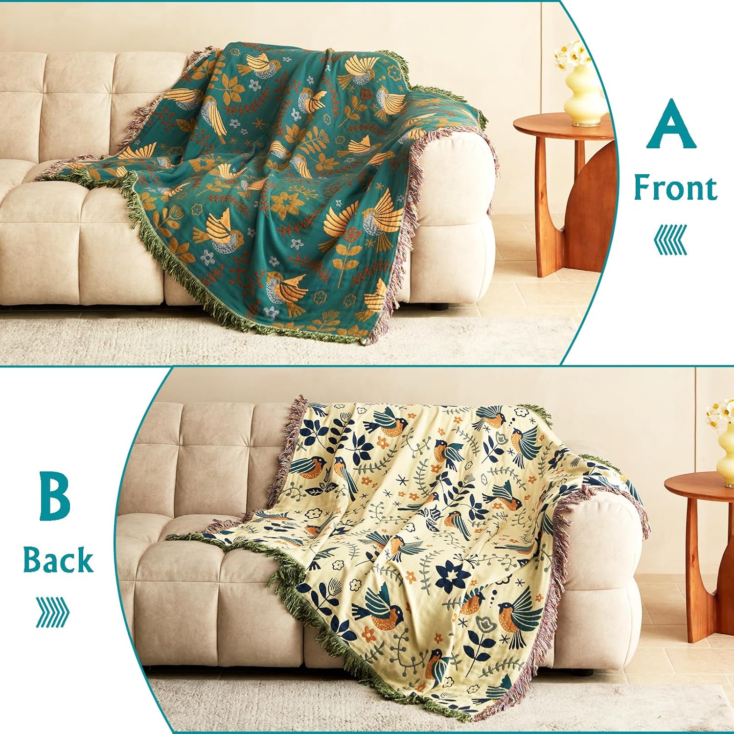 Throw Blanket for Couch Bed Cozy Cotton Blankets Twin,Soft Gauze Boho Throw Blanket Birds and Floral Doubel Side Embroidery,60"x80" Comfy Muslin Bed Blankets