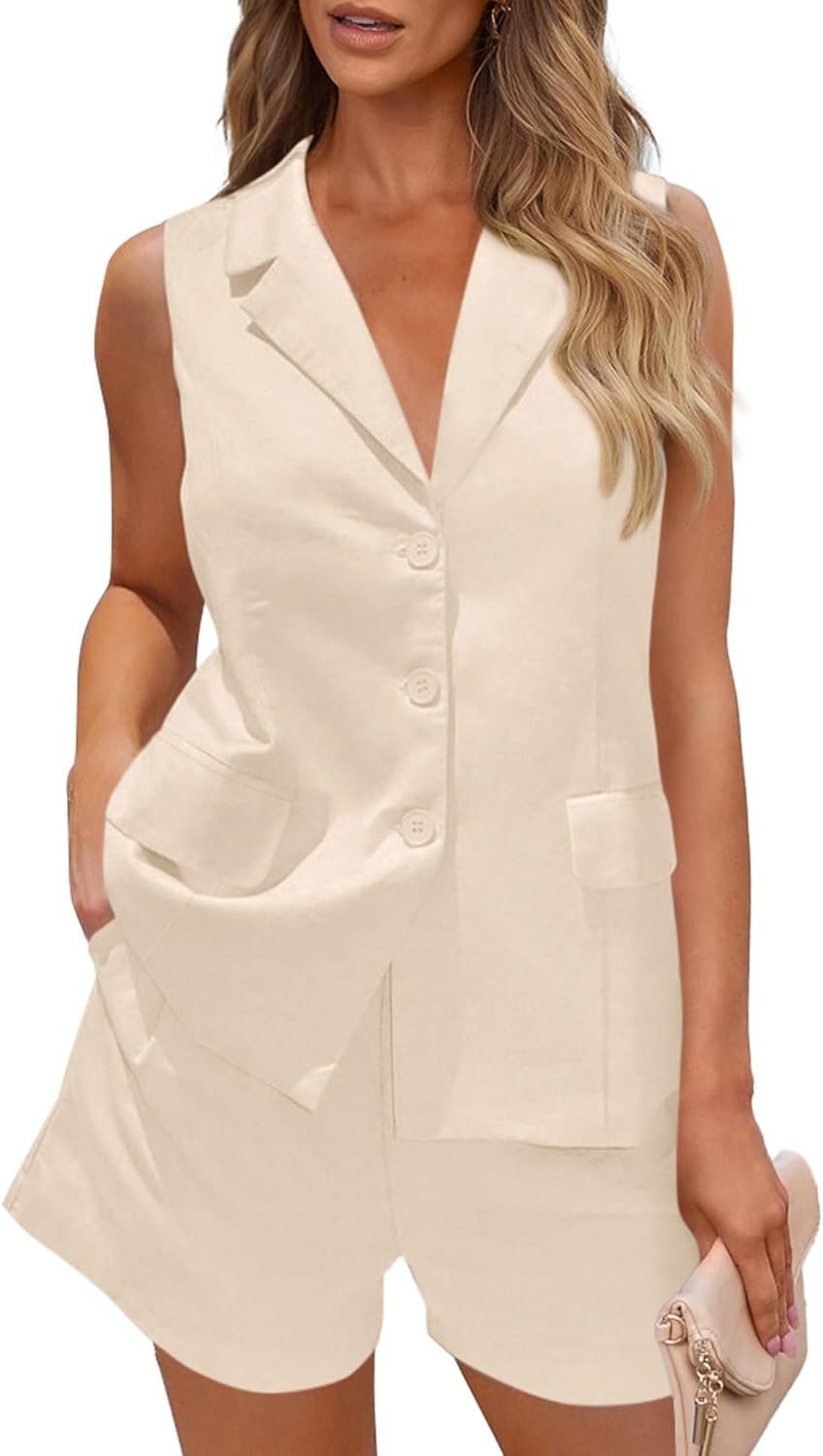 PRETTYGARDEN Women Summer 2 Piece Outfits 2025 Casual Lapel V Neck Button Down Vest Shorts Set Business Work Blazer Sets