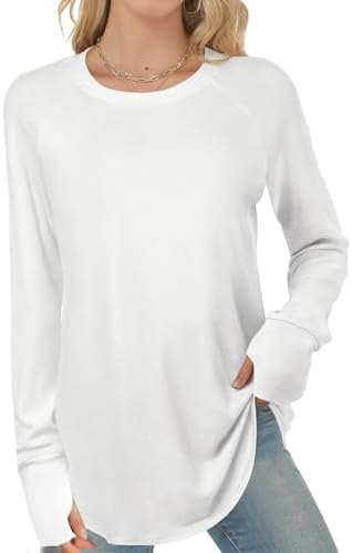 Fioris Long Sleeve Shirts for Women Tunic Tops to Wear with Leggings Crew Neck T-shirt Thumb Holes Loose Fit Shirt Curved Hem