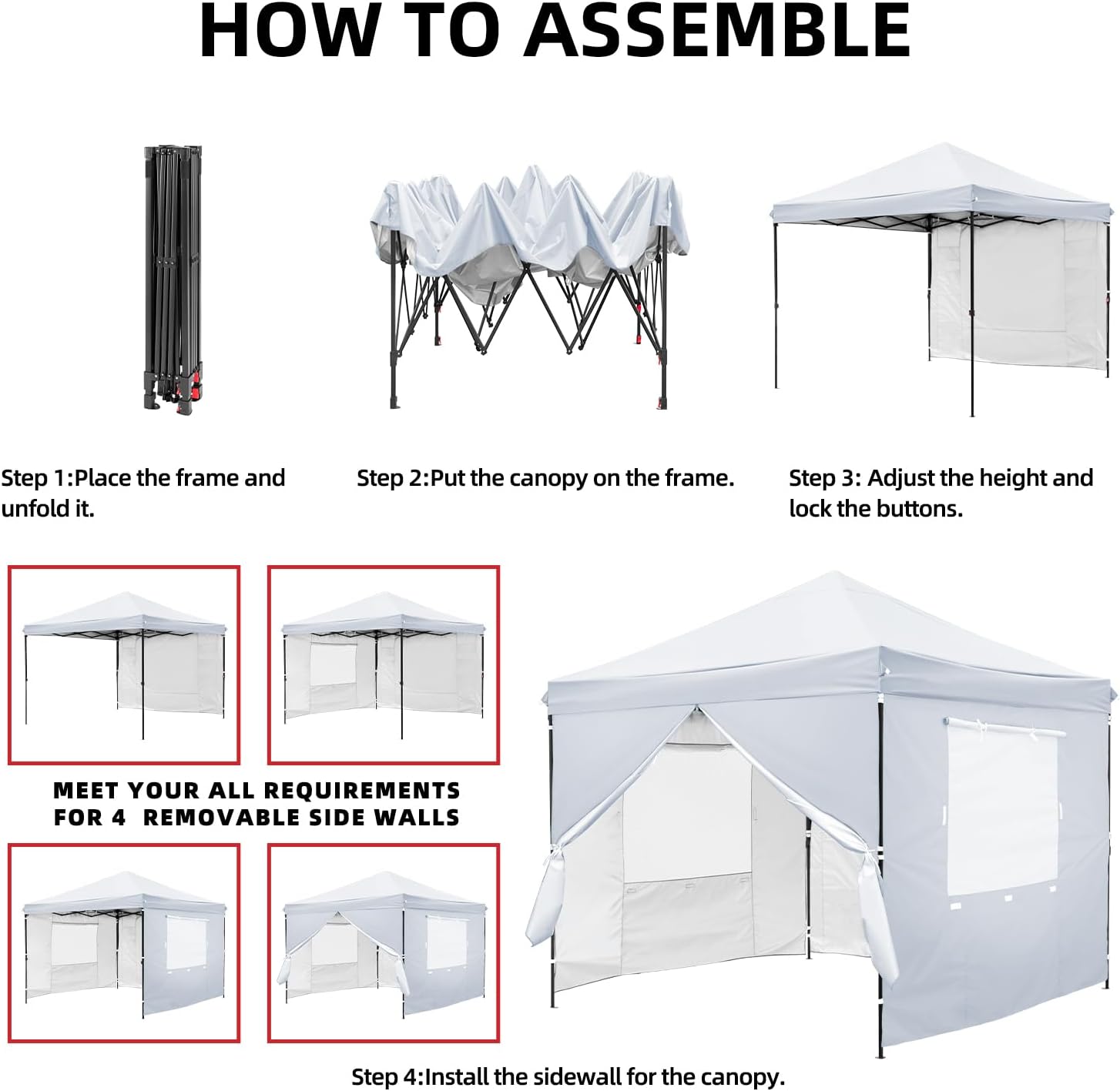Complete Set of Accessories: Our canopy tent Includes a 10x10 pop-up canopy frame, top cover, 4 sidewalls, 1 carry bag, and 4 sandbags, 4 guy ropes and 8 hooks, offering a comprehensive canopy solution for various outdoor settings.