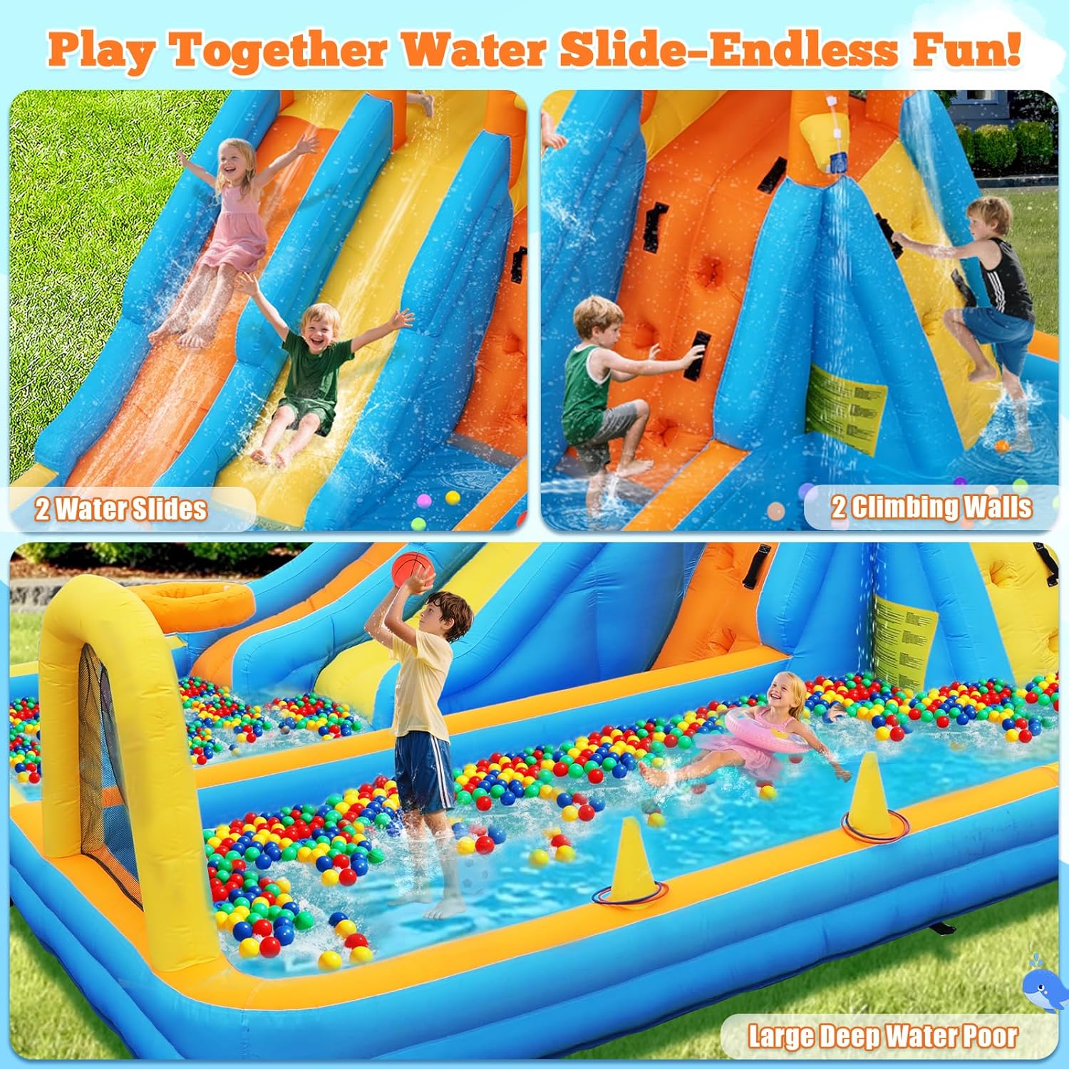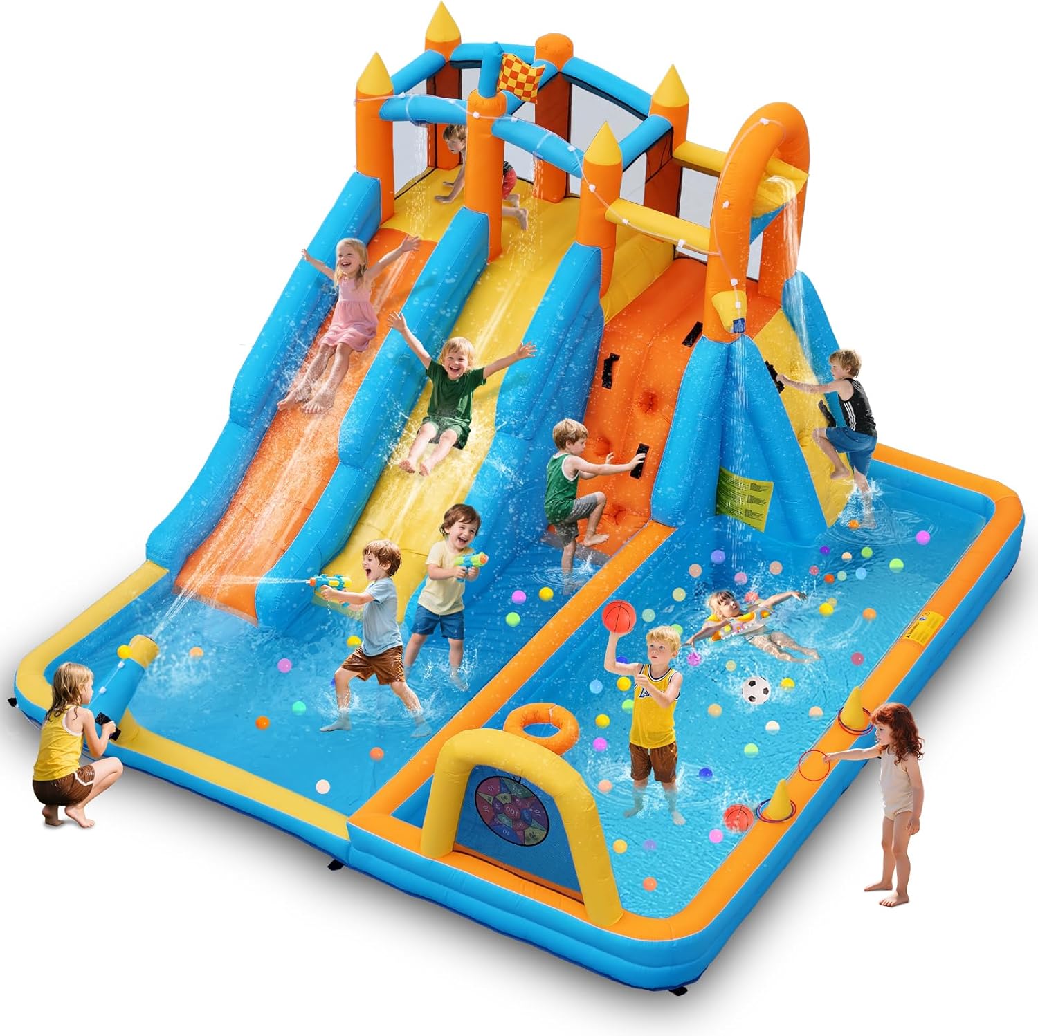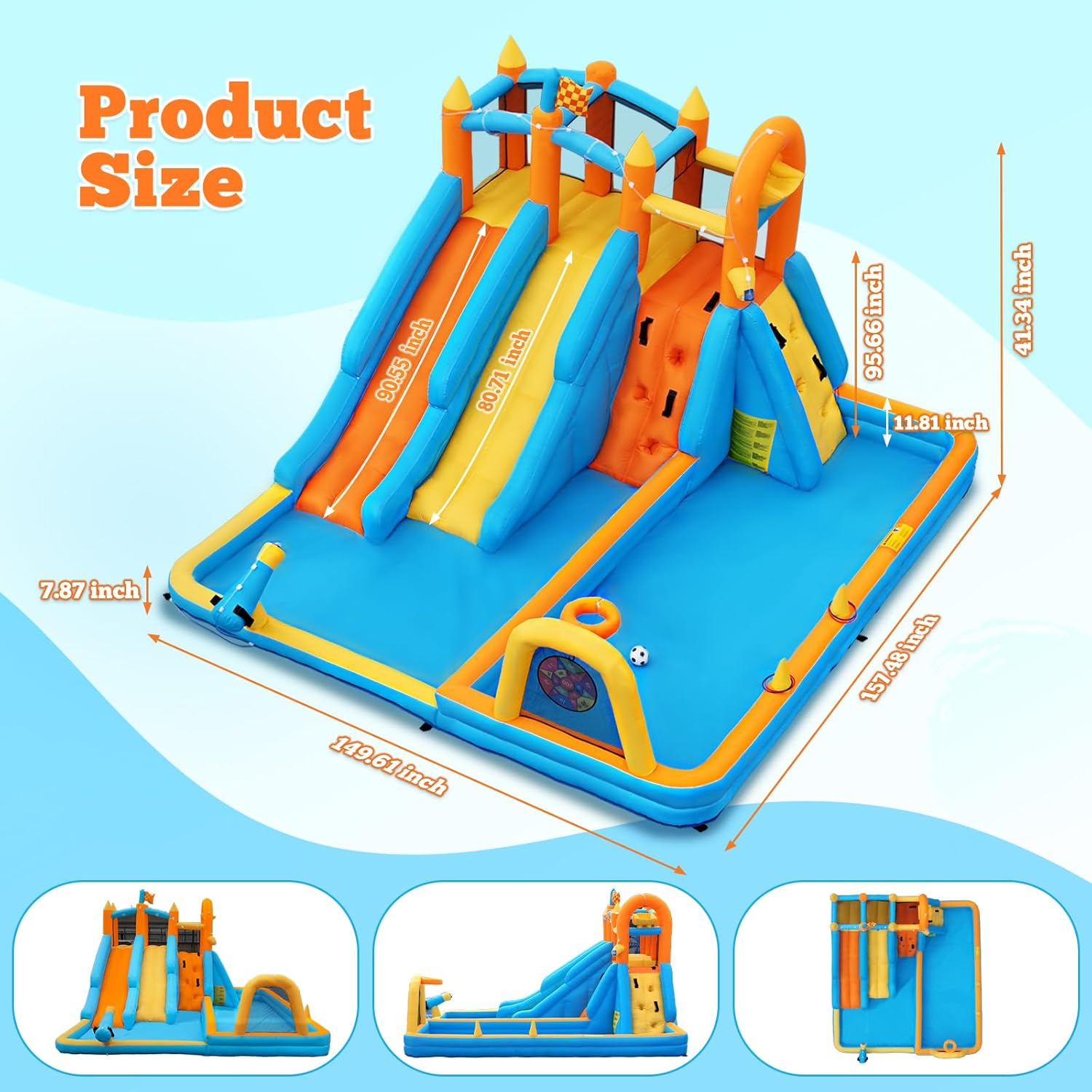 9 in 1 Inflatable Water Slide: The vibrant inflatable bounce house combines double water slides, double climbing walls, soccer goal, basketball hoop, water gun, dartboard game, ring toss game, water tank, and a large deep watre pool. It can provide endless hours of outdoor entertainment for kids