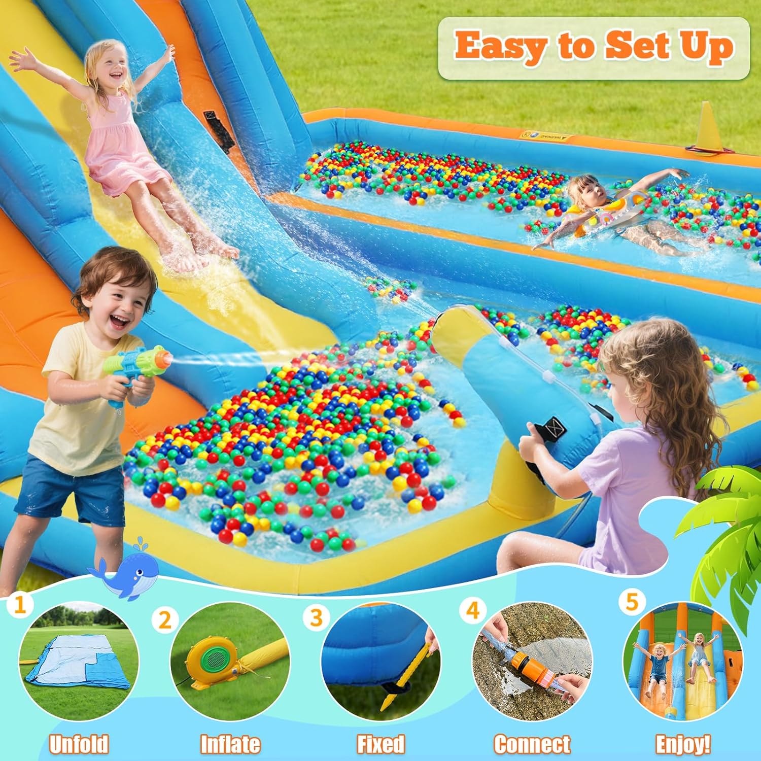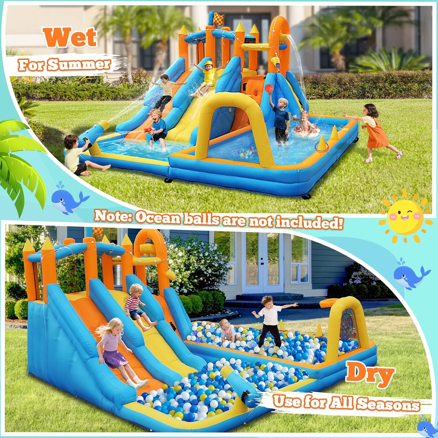 All-Season Inflatable Adventure Park:Slide into summer fun with inflatable water slides and cool pools. Bounce into winter joy with inflatable bounce house and colorful ball pits. Easily switch between thrilling water slides and indoor bounce house. Whether set up indoors or outdoors, it delivers all-season of fun and excitement for your little adventurer