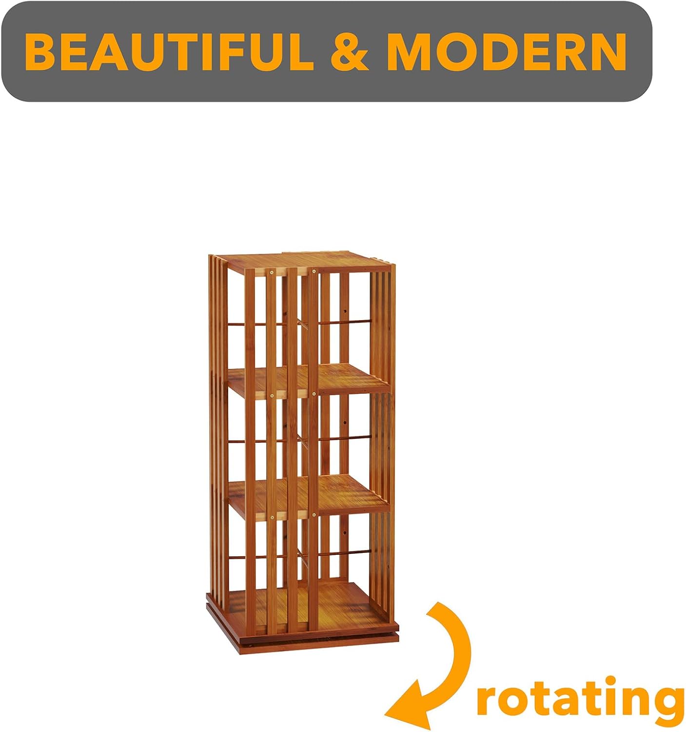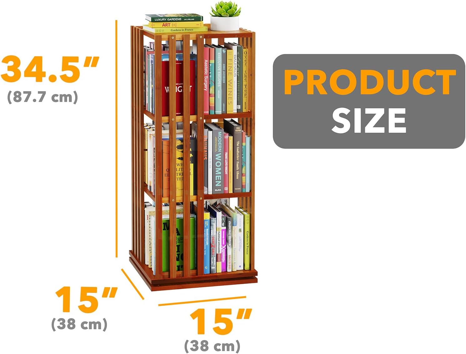 ORGANIZED AND STYLISH - Keep your books tidy and beautifully arranged with this rotating bookshelf tower; Its space saving structure allows you to store numerous books in a compact area. DIMENSIONS: 15"W x 15"D x 34.5"H