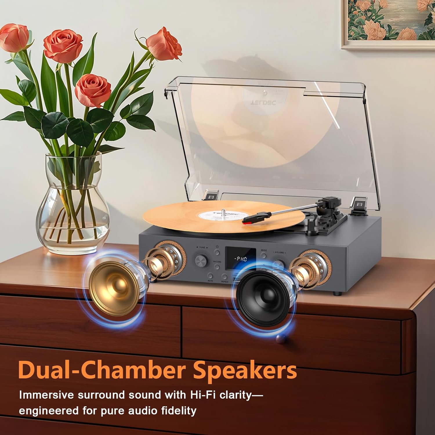 【VINTAGE LOOK】 Impeccable craftsmanship and durable materials ensure long-lasting, reliable performance. Experience the perfect blend of vintage aesthetics and modern functionality with our turntable turntables
