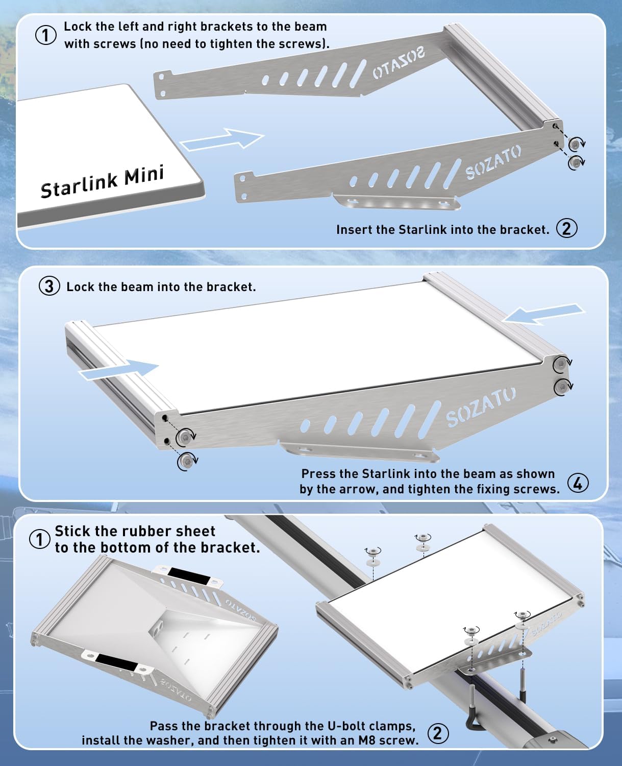 Wide Compatibility:This starlink mini roof rack mount adapts to roof racks up to 85 mm (3.34") wide and 50 mm (1.96") thick with adjustable rubber-coated U-bolts that prevent surface damage. The starlink mini car mount is suitable for car roofs, RV racks, boats, and trucks.