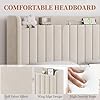 Stylish and Functional Upholstered Headboard: This upholstered headboard combines style and functionality with a tufted vertical stripe pattern, subtle wing design, storage space, and built-in charging ports, elevating both comfort and practicality