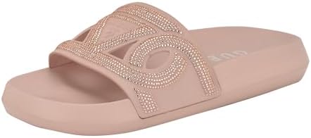 Shimmer in the sunlight wearing the Payca by Guess. Supported by a molded footbed, the rhinestone embellished upper outlines the signature Guess logo. Est. 1981, Guess is a global lifestyle brand and a symbol of a young, adventurous lifestyle.