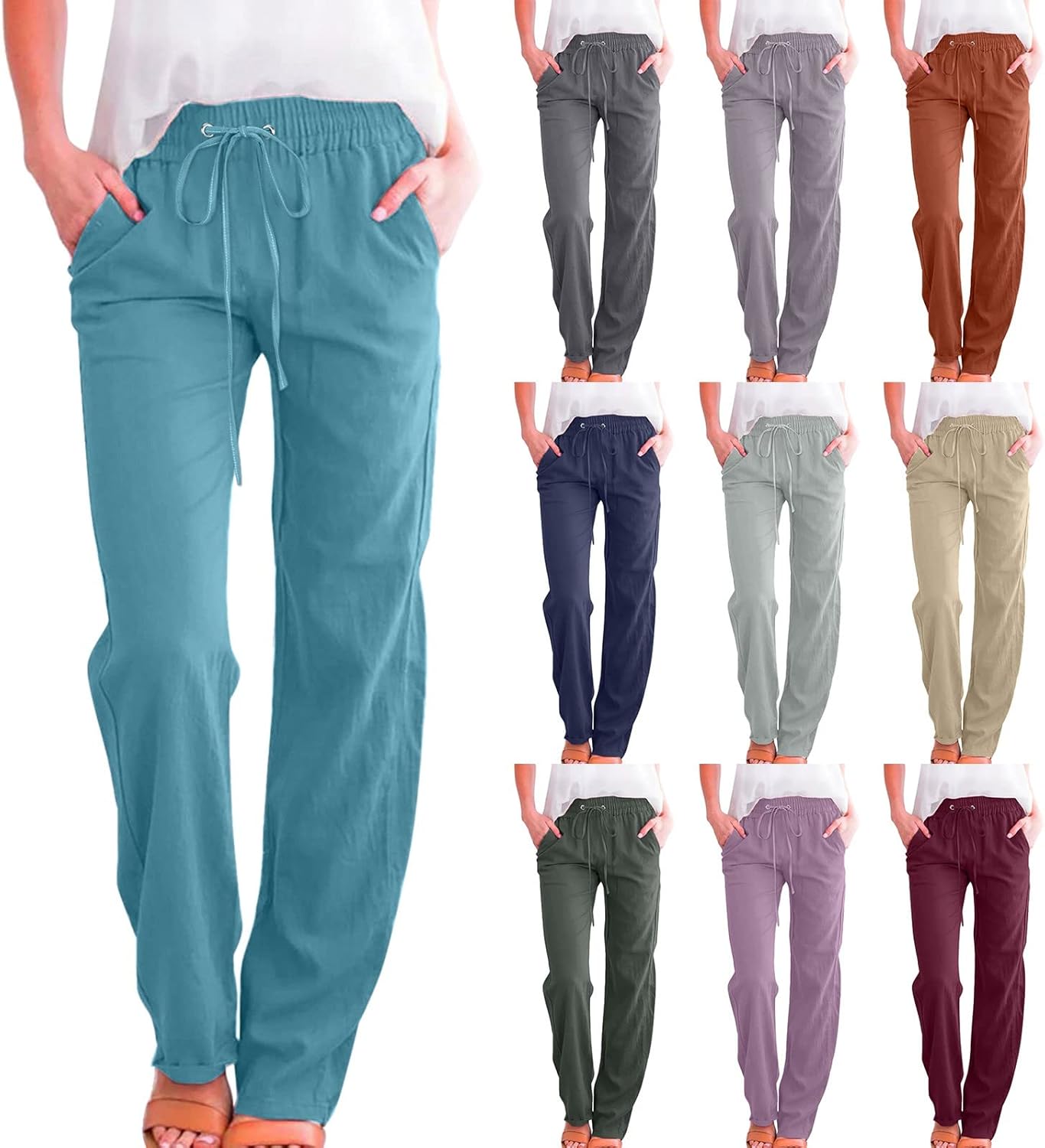 Womens Casual Cotton Linen Pants Lightweight Summer Relax Fit Elastic Waist Plus Size Solid Lounge Long Trousers