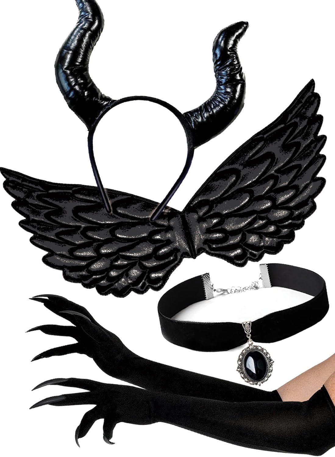 OLYPHAN Black Devil Costume for Women Demon Accessories for Mardi Gras Halloween Cosplay Devil Horns Headband, Goth Vampire Choker Necklace, Wings & Claw Gloves Gothic 4 Pk Costumes Set