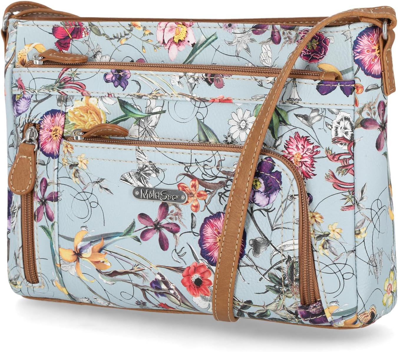 The summerville east West crossbody is stylishly designed with top zip main pocket uniquely designed front face has a zipper pocket a half zip around pocket on right side left side with vertical zipper Pkt On the back outside There is a specially designed slit pocket for your cell phone Inside features include 2 drop in pockets a back wall zip pocket-10"l x 7 1/2" H x 1 1/2" D - 26" Adjustable strap