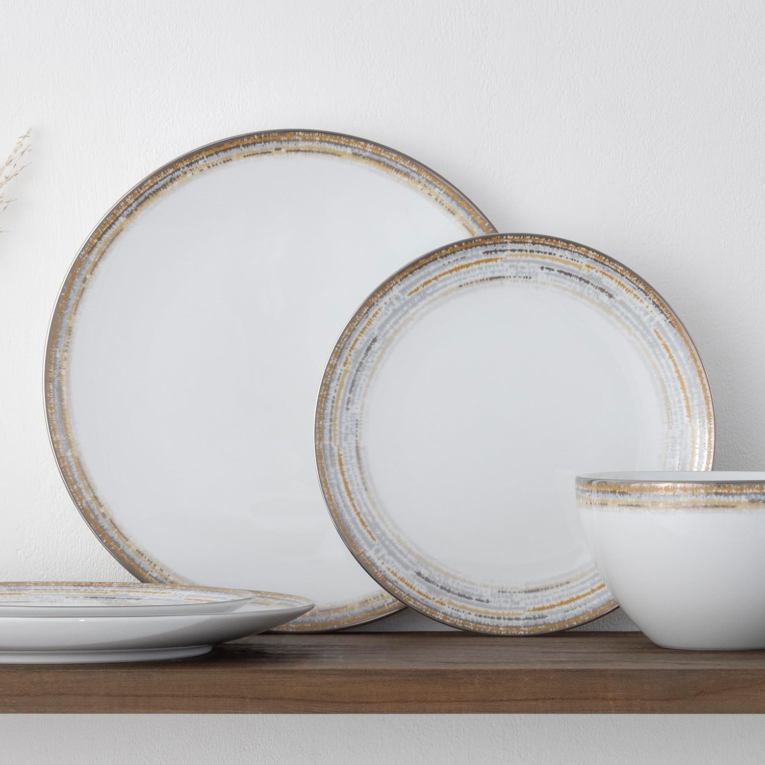 Raylan features both modern design and functionality. Each item is adorned with a bold presentation of a blurred design of mixed metallics, paired with a gleaming, microwave-safe platinum band. Raylan offers a 12-piece set, place settings, individual components, and serving pieces. Raylan is designed for daily use and is microwave and dishwasher safe