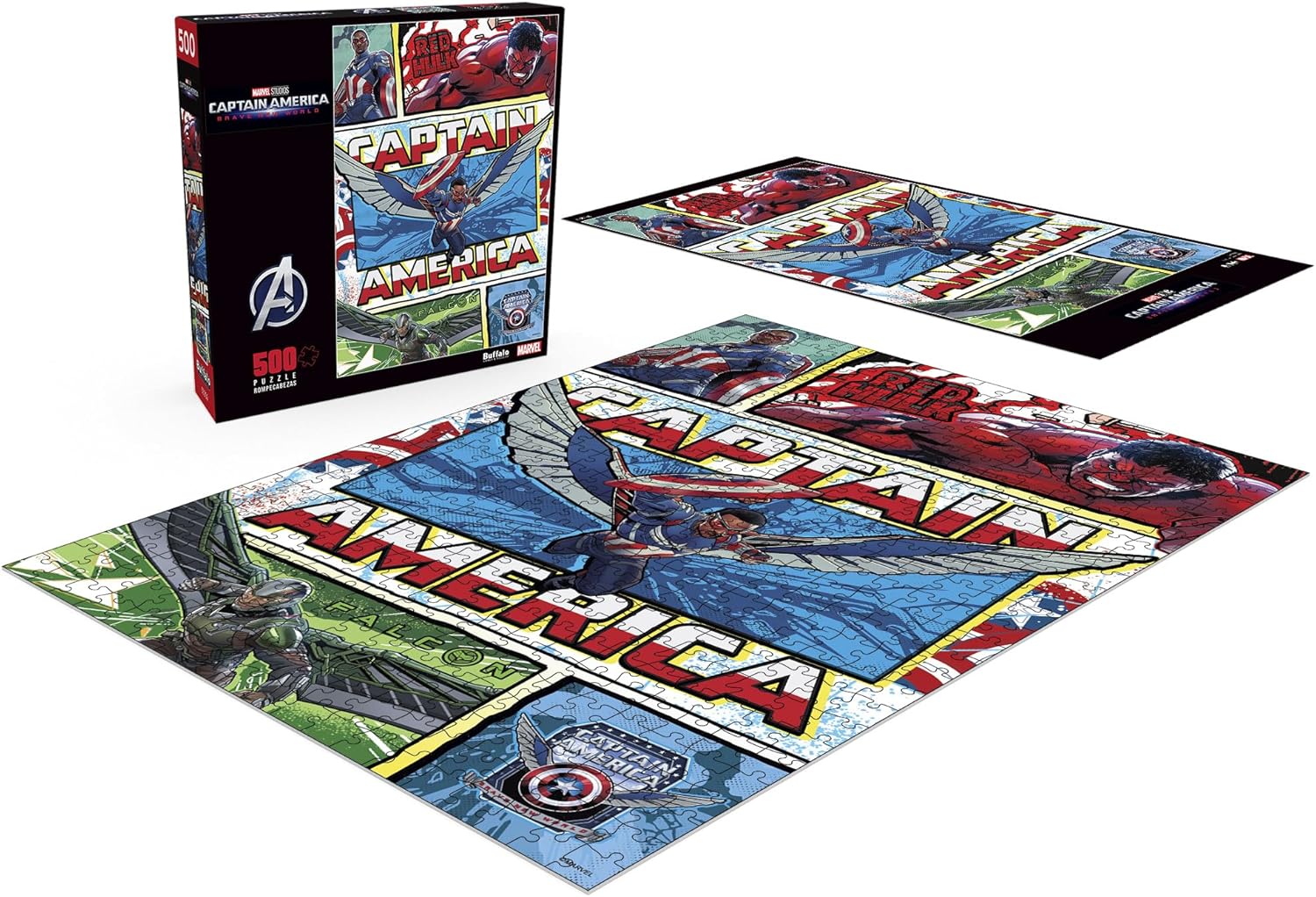 This 500-piece 21.25 x 15 inch interlocking Marvel Studios jigsaw puzzle by Buffalo Games is titled “Captain America: Brave New World”. It features comic book images of Sam Wilson’s Captain America, the Falcon and Red Hulk bursting out of their frames and ready to jump into battle. Every Buffalo Games jigsaw puzzle is manufactured from recycled puzzle board. A precision cutting technique guarantees that every piece will fit soundly with the company's signature Perfect Snap™. A bonus puzzle poster is also included so that you have a handy reference of what the completed puzzle should look like while you put yours together. © Marvel 2025