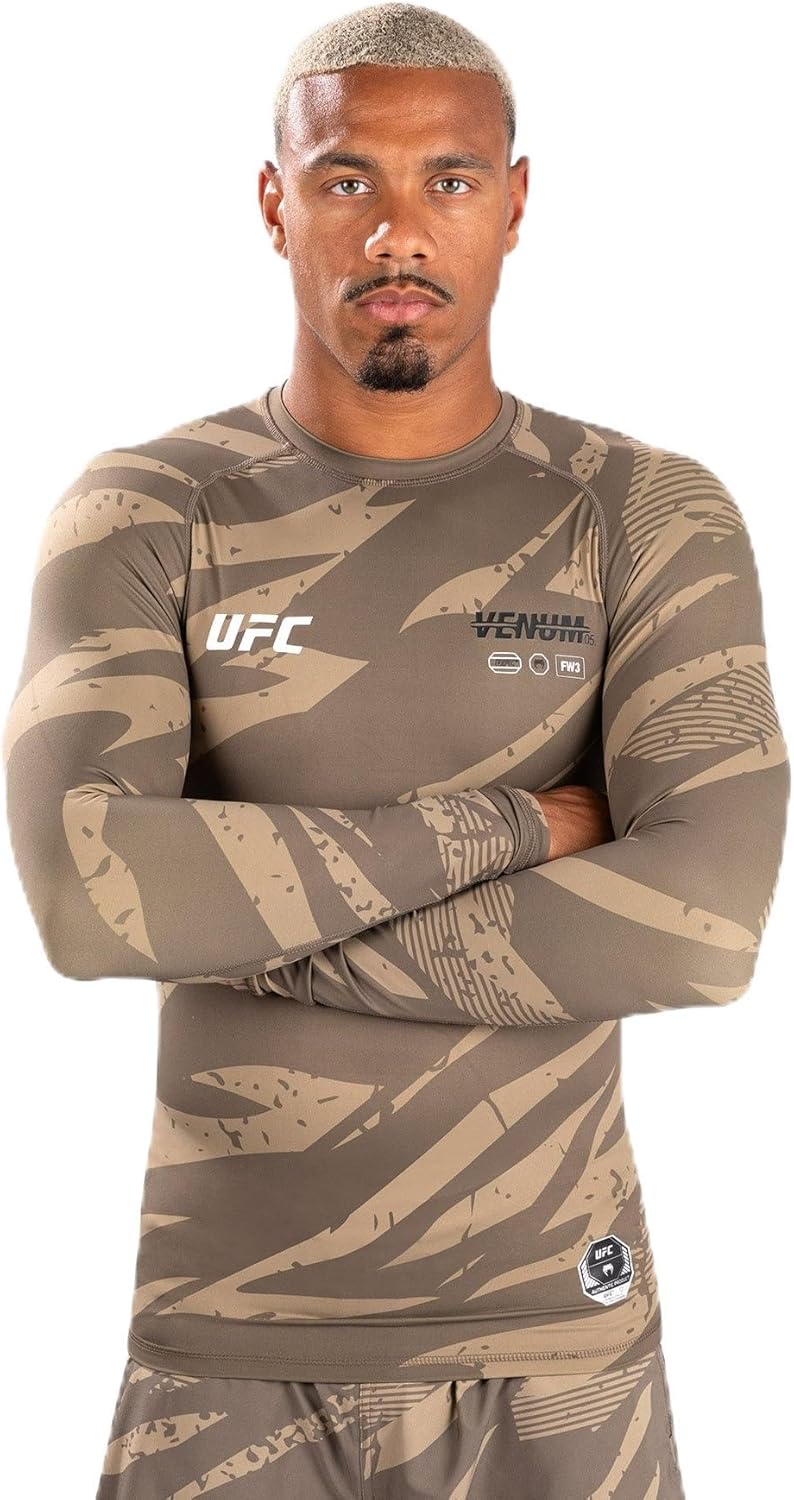This Long Sleeve men’s rashguard is part of the latest high-octane collection from Venum and the UFC. The UFC Adrenaline by Venum collection features hardworking performance fabrics and thoughtful detailing, to keep pace with competing UFC athletes during Fight Week and through Fight Night. UFC Adrenaline by Venum Men’s Fight Week Performance Long Sleeve Rashguard serves as a second skin to provide protection against injury and freedom of movement during grappling. The rashguard’s compression technology also helps encourage muscular recovery.Its bold camouflage print, with its bronze and white Venum and UFC logo detailing, is inspired by athletes who step into the Octagon, ready to strike and counter strike. This rashguard matches perfectly with the men’s performance tights and other products from the same collection.