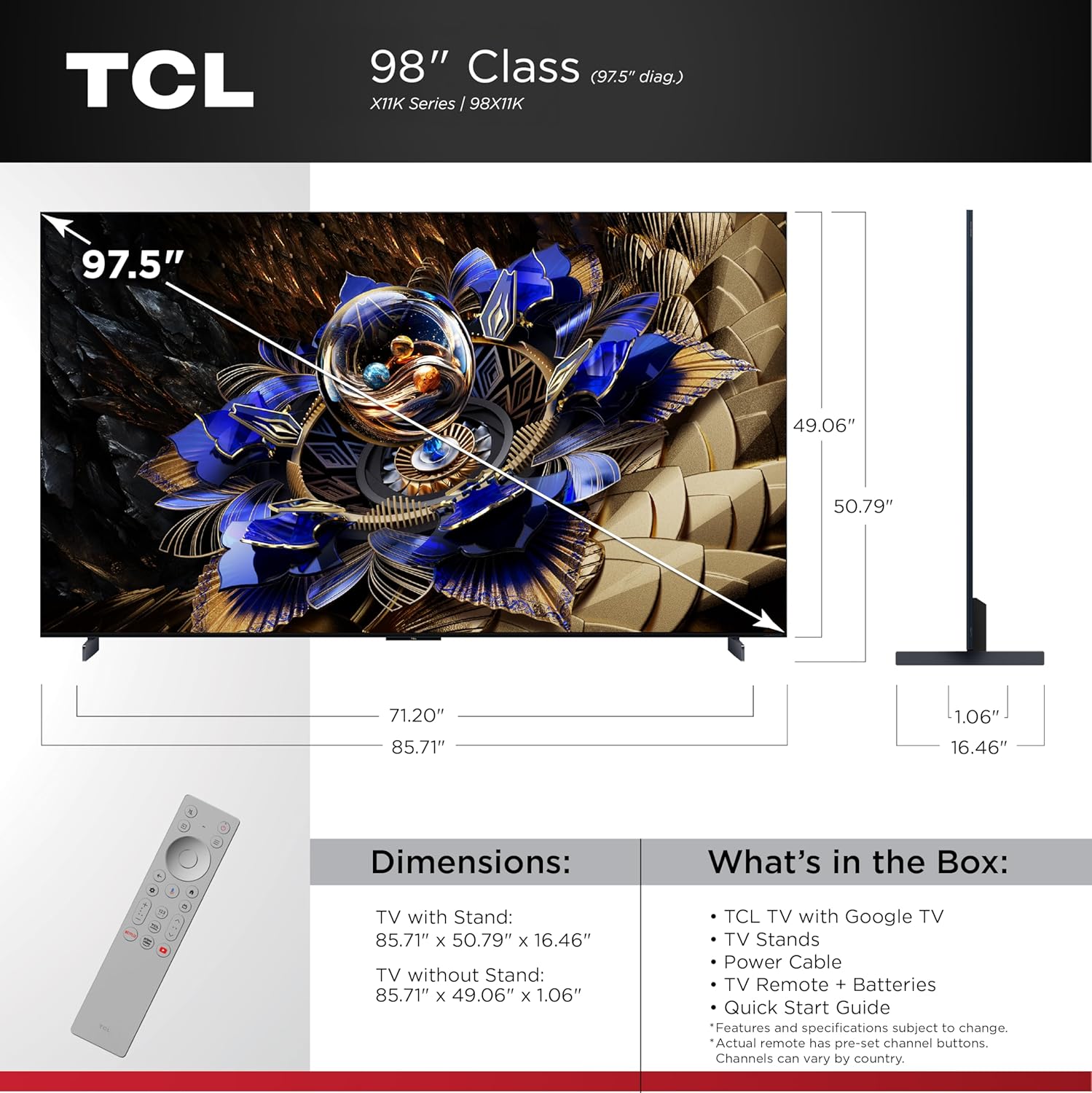 TCL 98-Inch Class X11K Series QD-Mini LED 4K UHD Google Smart TV Ultra Premium Mini-LED TV - QLED, 144hz, Anti-Reflective Screen, Bang & Olufsen Audio, Dolby Atmos (98X11K, 2025 Model)