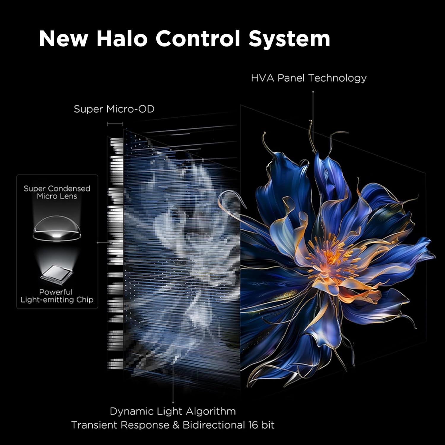 TCL HALO CONTROL SYSTEM: An advanced Technology Suite that includes the New Super High Energy LED Microchip, Super Condensed Micro Lens, Micro-OD Reduced Optical Distance, High Contrast HVA Panel, Enhanced QLED, Zero Delay Transient Response, Bi-direction 23-bit Backlight Controller, and Dynamic Light Algorithm for Stunning “Halo-Free” Images.