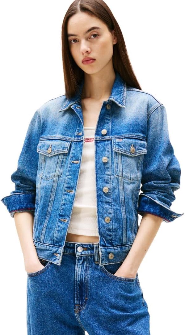 Introducing the tucker denim jacket from Tommy Jeans, designed with functional pockets and embroidered details for added style and comfort. Crafted from lightweight materials, this jacket provides lightweight warmth and breathability, making it perfect for everyday wear. With meticulous attention to detail, this jacket features embroidered details for a touch of sophistication. Its regular silhouette offers a casual yet comfortable look, tailored slightly slimmer through the chest and shoulders, tailored relaxed through the chest and shoulders. Pair it effortlessly with your favorite Tommy Hilfiger shirts, tees, sweaters, shorts, pants, or jeans for versatile styling options suitable for any occasion, whether it's a casual outing or a formal event. Ideal for daily wear, work, school, vacation, gym sessions, or sports activities, this Women's jacket is a versatile addition to any wardrobe. Treat yourself or surprise a loved one with this timeless piece, perfect for mothers, sisters, girlfriends, wives, daughters, or friends. Elevate your style with the unbeatable quality and everyday sophistication of Tommy Jeans women's jacket.