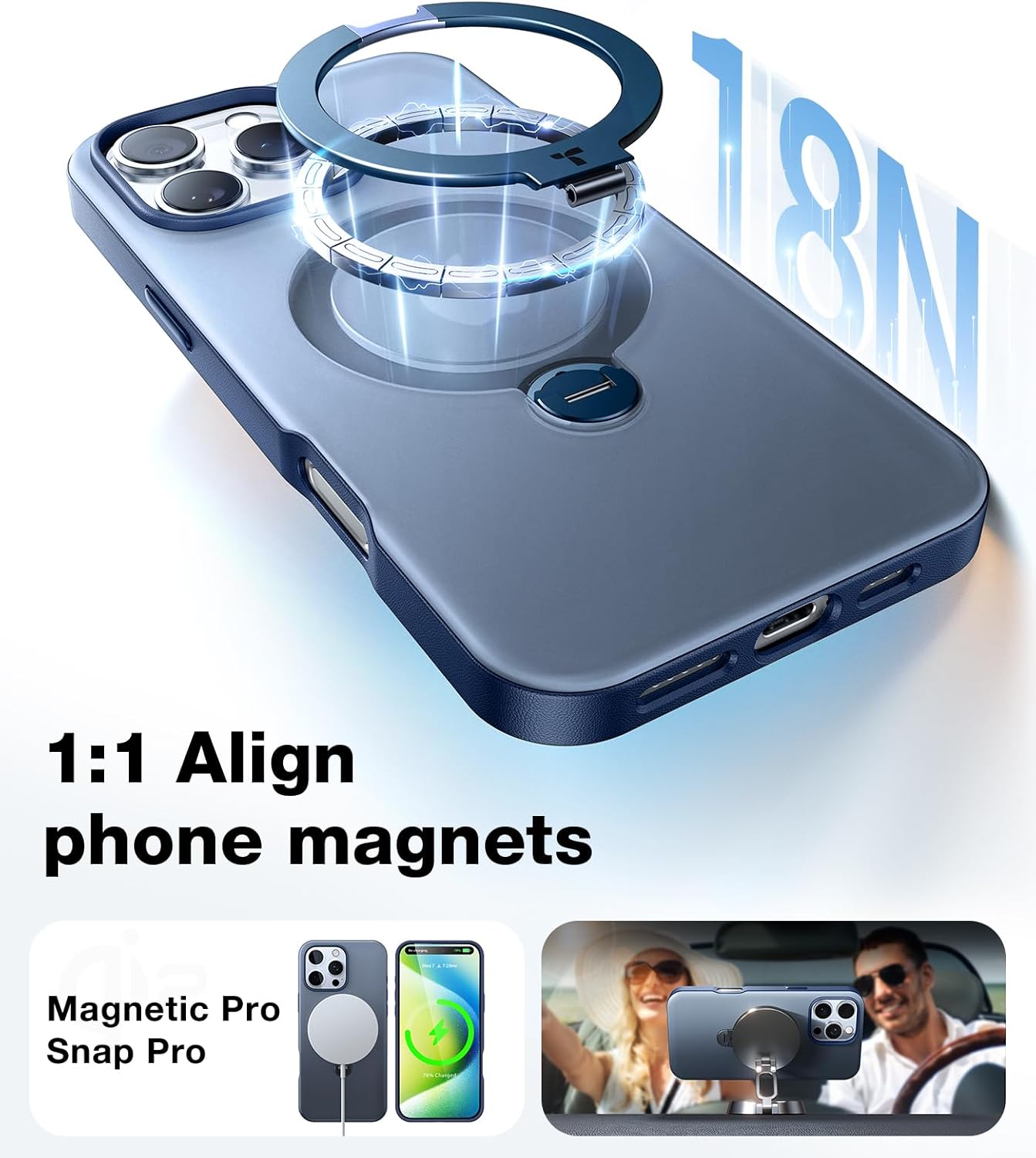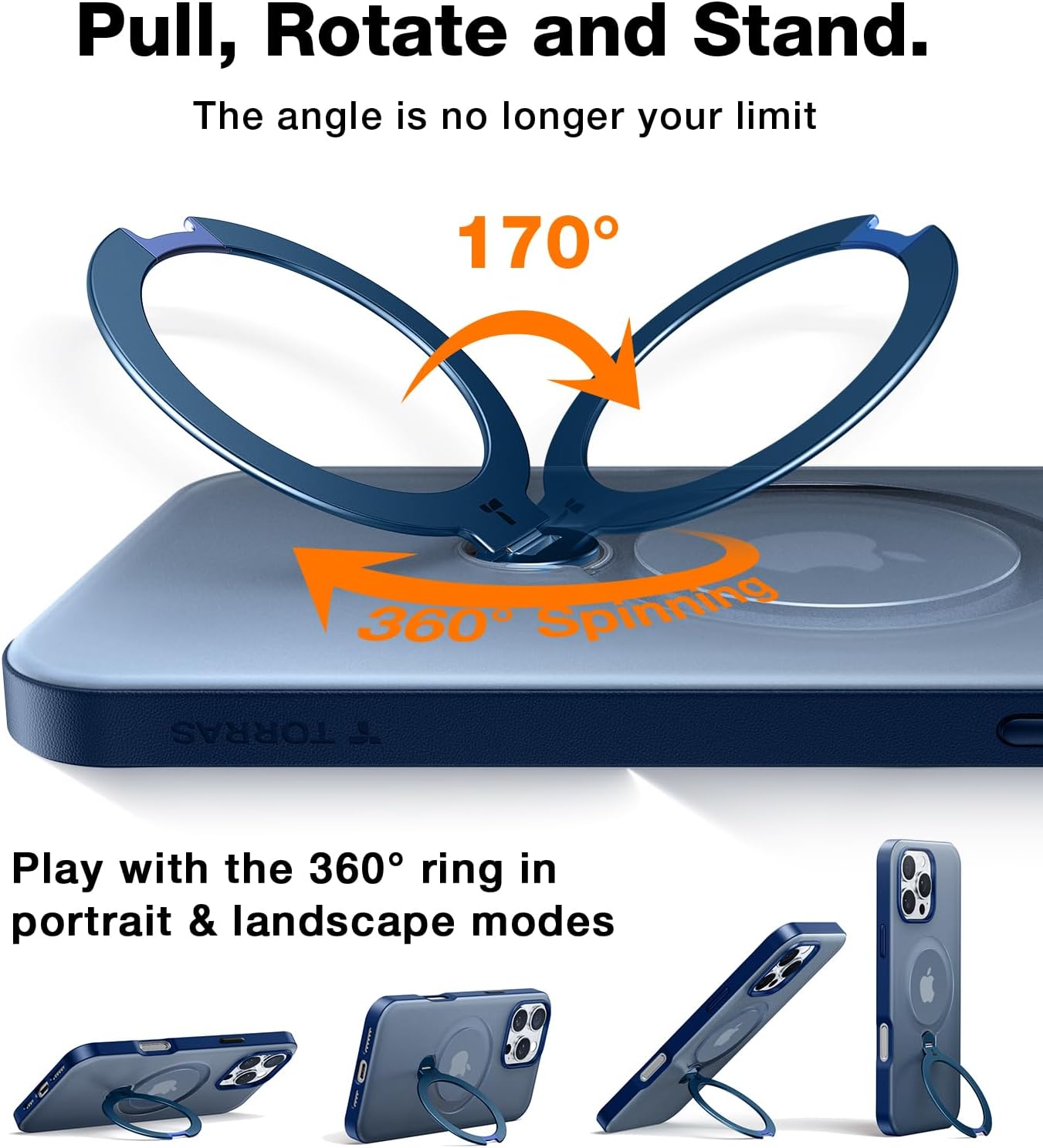 TORRAS Upgraded 360 Spin Magnetic Stand for iPhone 16 Pro Case, Fit for MagSafe, Built-in Kickstand & Ring Holder, Mil-Grade Protective Soft Edge Translucent Slim Case for iPhone 16 Pro, Blue 6.3''