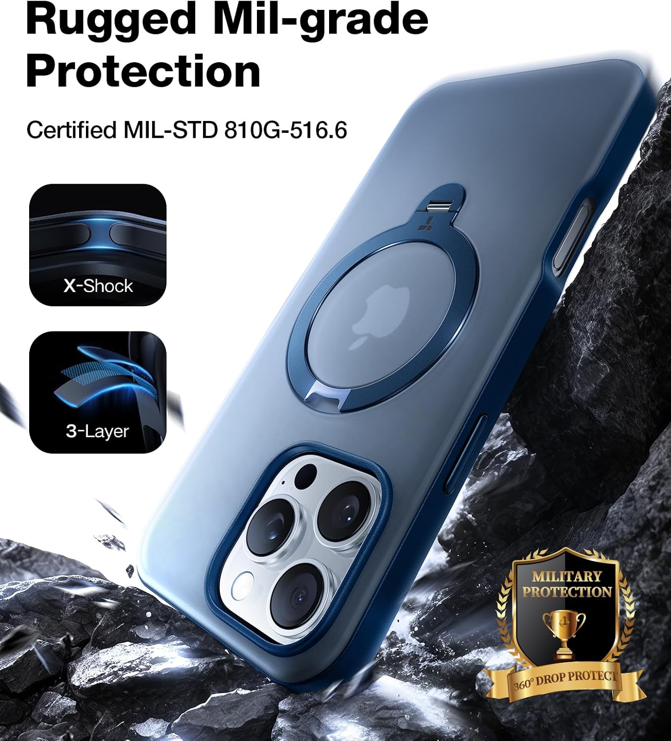 Pioneering 360° Spin Stand: The spinning stand case for iPhone 16 Pro Case provides a wider and more flexible adjustment angle: Place it in landscape mode for watching movies, switch to portrait mode with a unique angle up to 90°, it can stand perfectly vertical for a timer photo like a mini tripod. No matter how high or low your desk is, just spin it boldly to achieve any of your viewing angles! Undergoing 30,000 rotation tests, the spinning stand has a longer service life than ever before