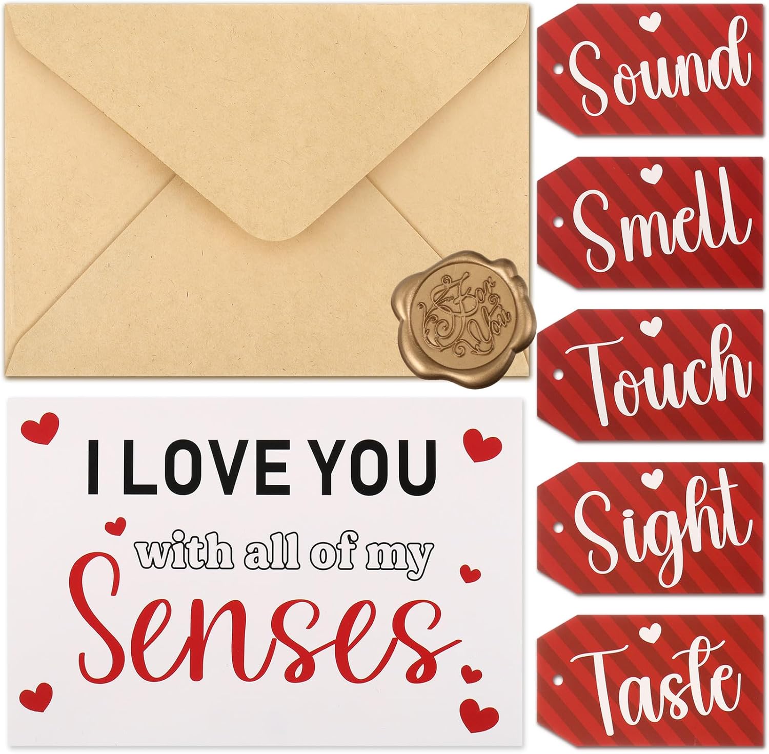 Five 5 Senses Gift Cards for Him Her with Labels Set I Love You with All of My Senses Gift Greeting Card for Anniversary Birthday Valentines Day Boyfriend(Kraft,Red)