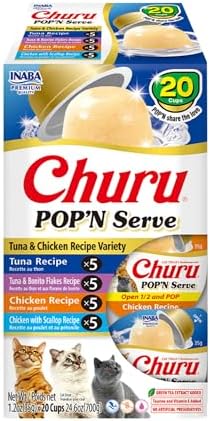 POP'N SHARE THE LOVE: Churu Pop'N Serve is a unique, perfectly portioned cat treat in a 1.2-ounce cup. Just peel back the easy-to-open lid, pop it into a dish or onto your cat's kibble, and serve the deliciousness