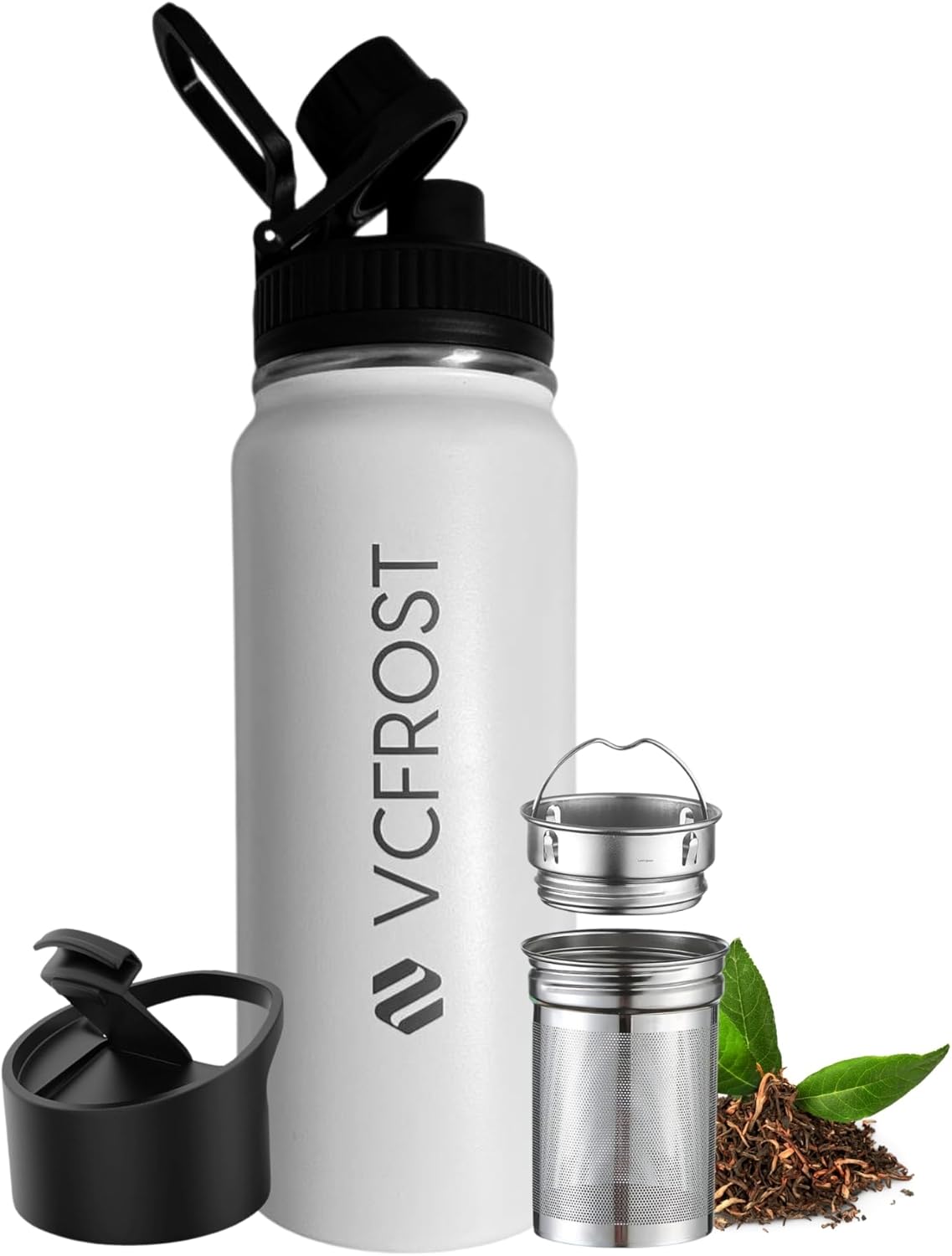 Tea Infuser Bottle With Two Lids Hot Cold Dual Function 20oz Insulated Stainless Steel Loose Leaf Tea Bottle Leakproof BPA Free 12h Hot 24h Cold Travel Mug For Office Gym Water Tea Bottle