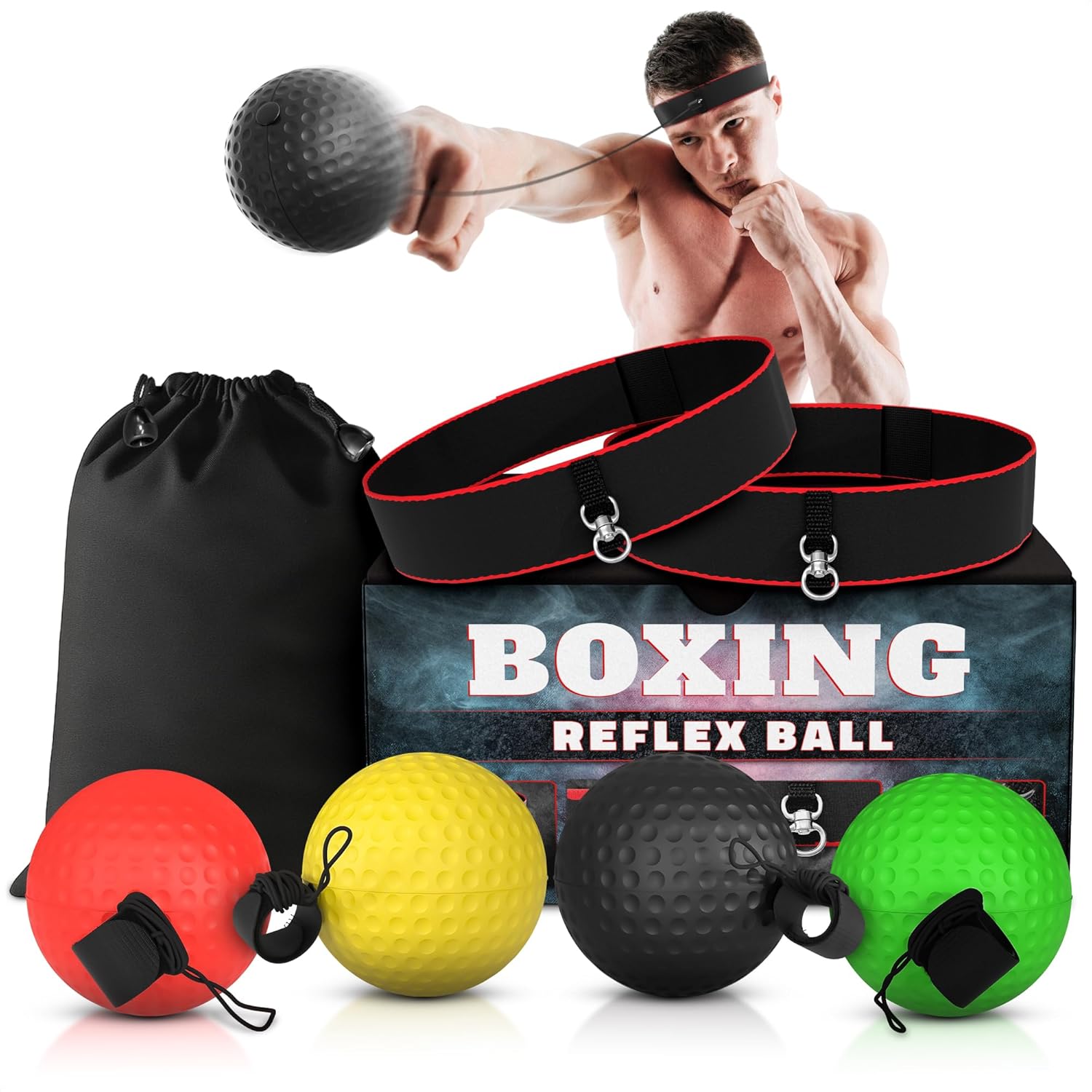 Boxing Reflex Ball 4-Level Set: Includes 4 color-coded balls—Black (balance), Red (speed), Green (control), Yellow (strength). Improve coordination, focus & reflexes with this boxing ball headband trainer