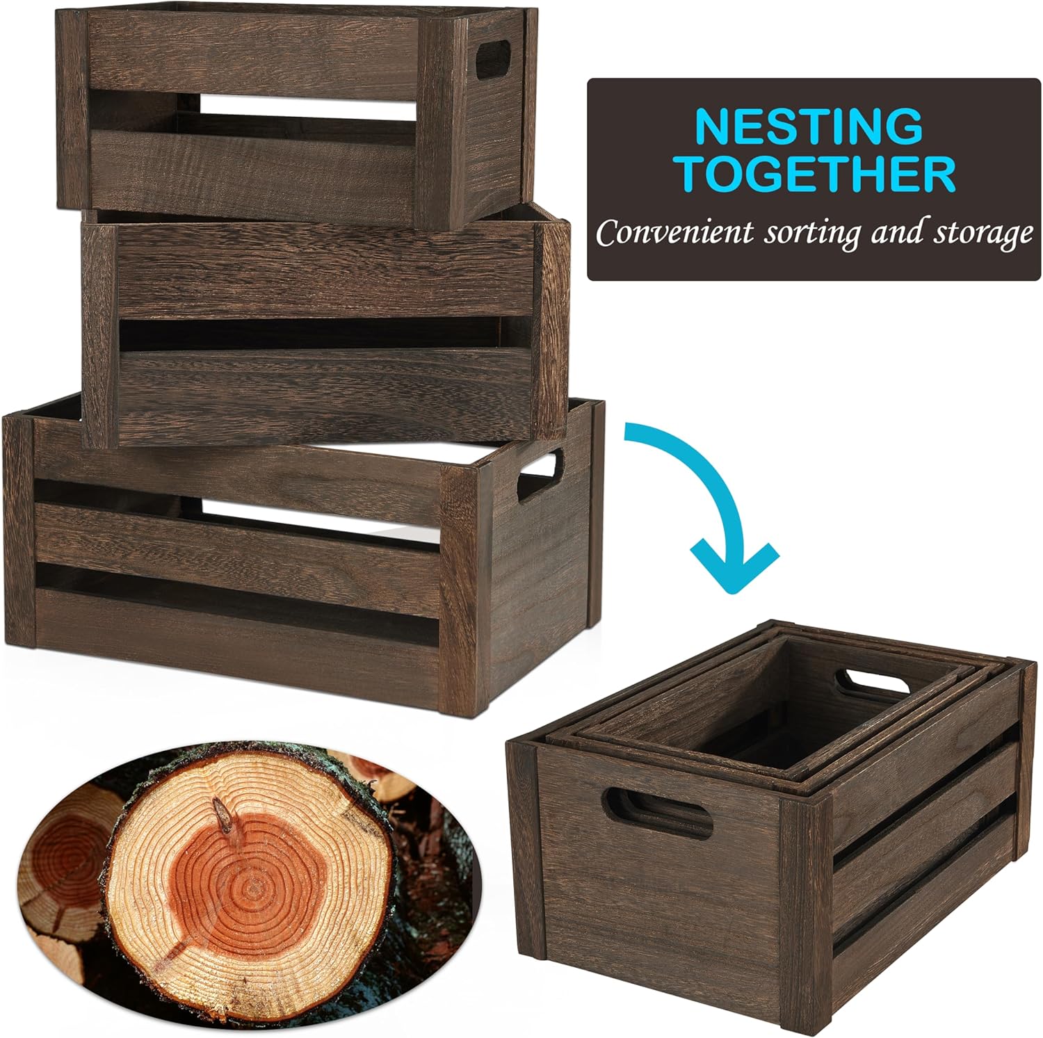 ELONG HOME 3 Pack Nesting Wooden Crates, Rustic Wood Basket with Handles, Decorative Farmhouse Wooden Storage Boxes