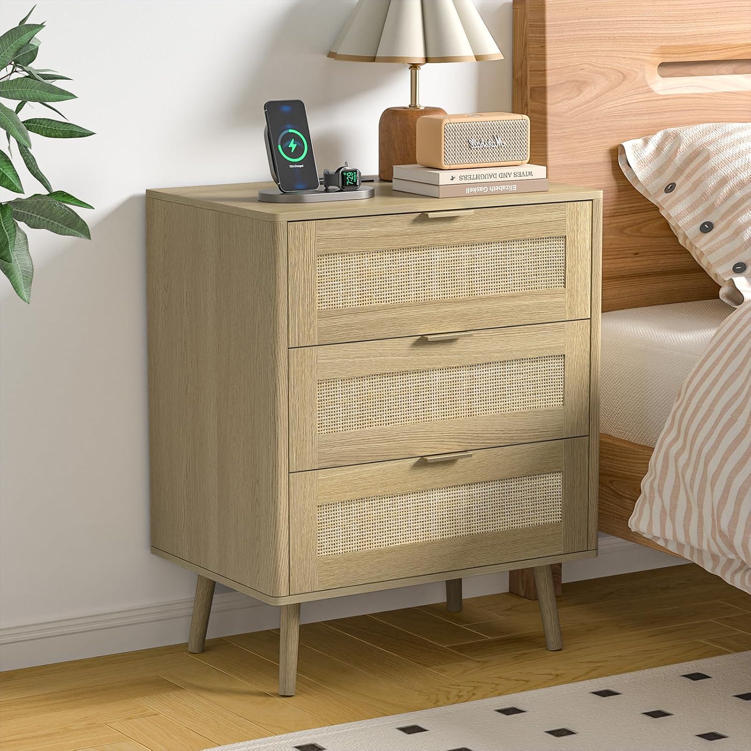 Rattan Nightstand with Charging Station, Bohemia Night Stand with 3 Drawers, Wood End Table for Sofa, Bedside Table with Metal Handle for Bedroom Dorm Small Space, Natural Wood