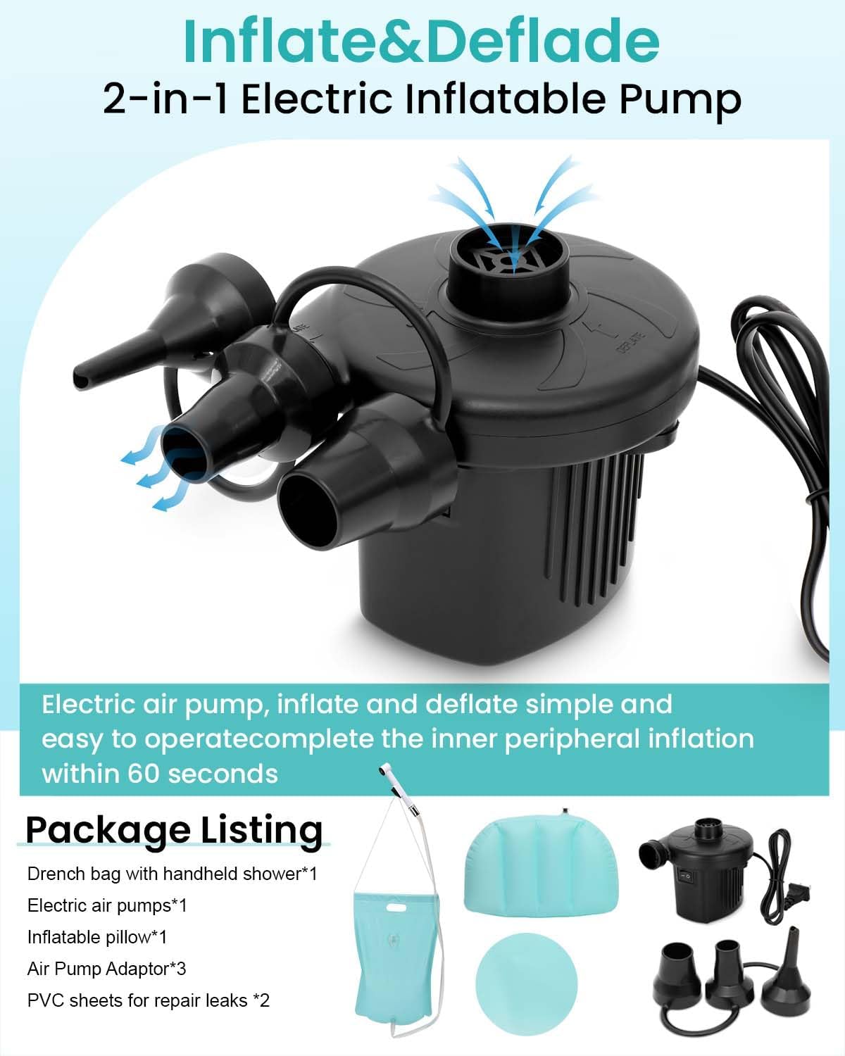 【Easy to Set Up and Use】With the included electric air pump, this portable bathtub inflates and deflates in minutes. A 1.9-gallon water bag and shower head make rinsing easy and controlled, while the built-in drain system and extra-thick hose ensure fast and hassle-free water removal. An inflatable pillow provides added neck and head support for a more relaxing full-body wash.