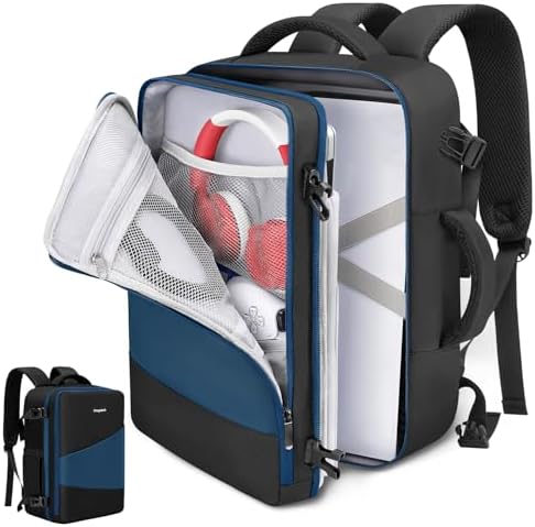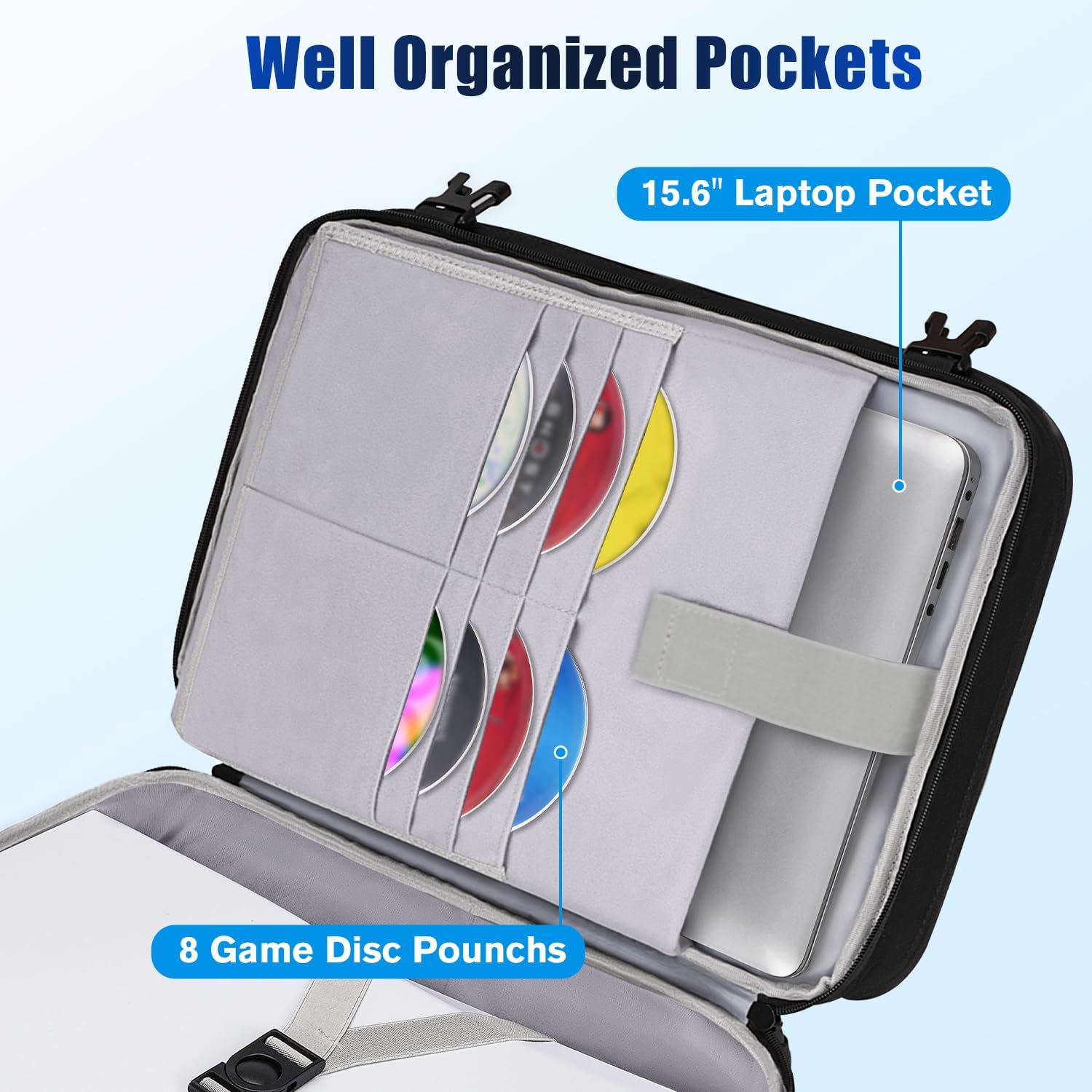 Large Capacity Storage: This blue gaming bag measures 16.5 x 11.8 x 7 inches and features multiple separate pockets to keep your PS5 console, controllers, cables, discs, and accessories all in their place. It also has a padded compartment that fits laptops up to 15.6 inches, so everything stays safe and tidy on the go.