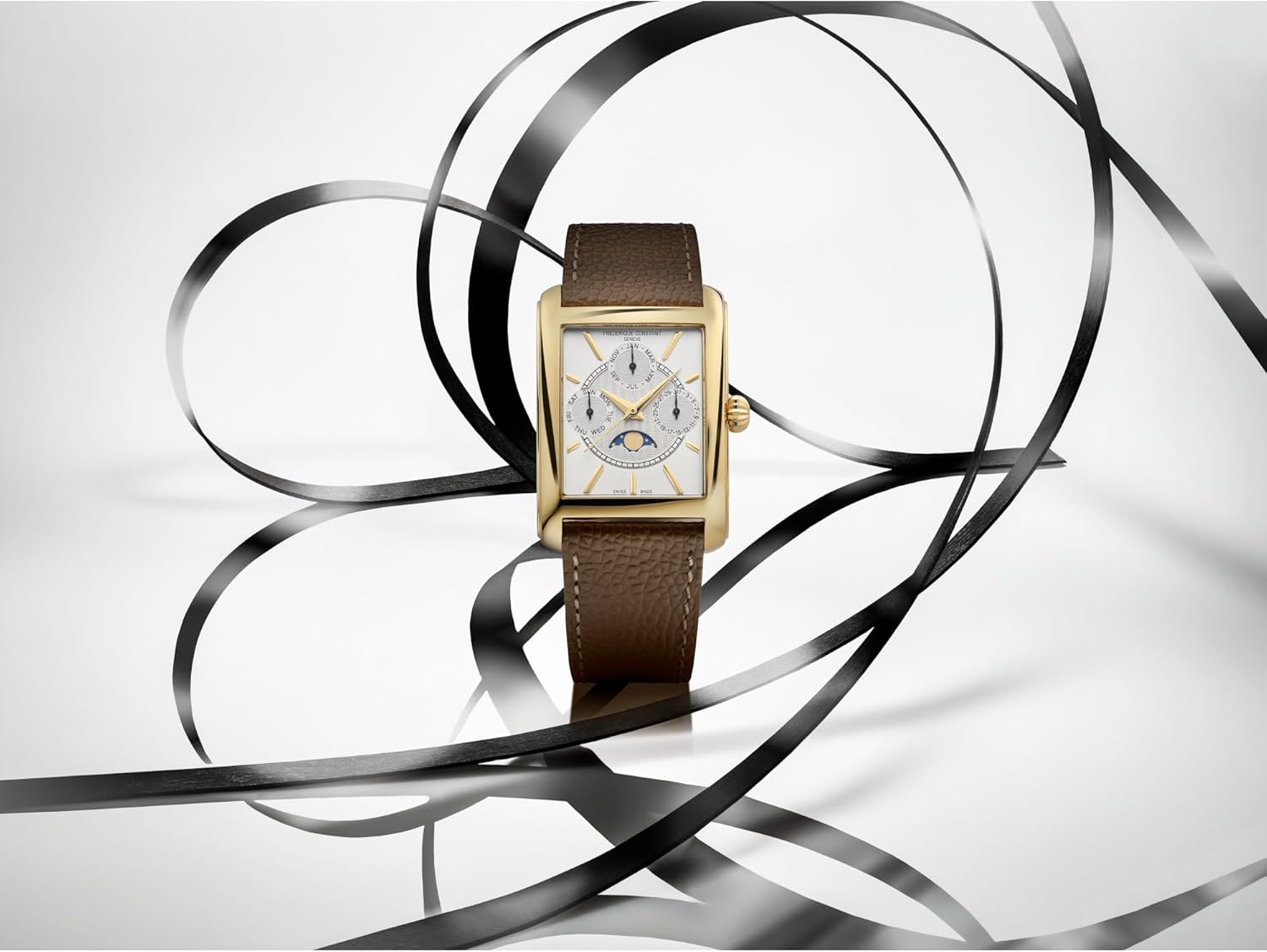 This Classics Carrée is now being released featuring a quartz movement and a triple calendar. Set on a gold tone stainless steel 30.4x33.3mm case, the triple calendar will monitor your valuable time in style and is sure to become a cherished staple accessory of your everyday life. This timepiece also features the brands iconic moonphase at 6 o'clock. The gently curved case fits the wrist perfectly and has an off-white dial with gold-tone indexes, and hour and minute hands, along with a black minute track, all complimented by a brown lizard embossed leather strap