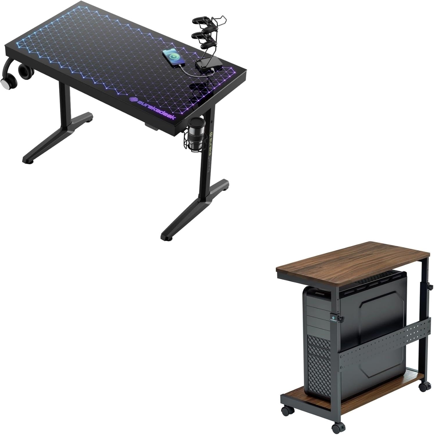 EUREKA ERGONOMIC RGB LED Gaming Desk, Music Sync Lights Up Tempered Glass Desktop,with Height Adjustable Computer Tower Stand Walnut