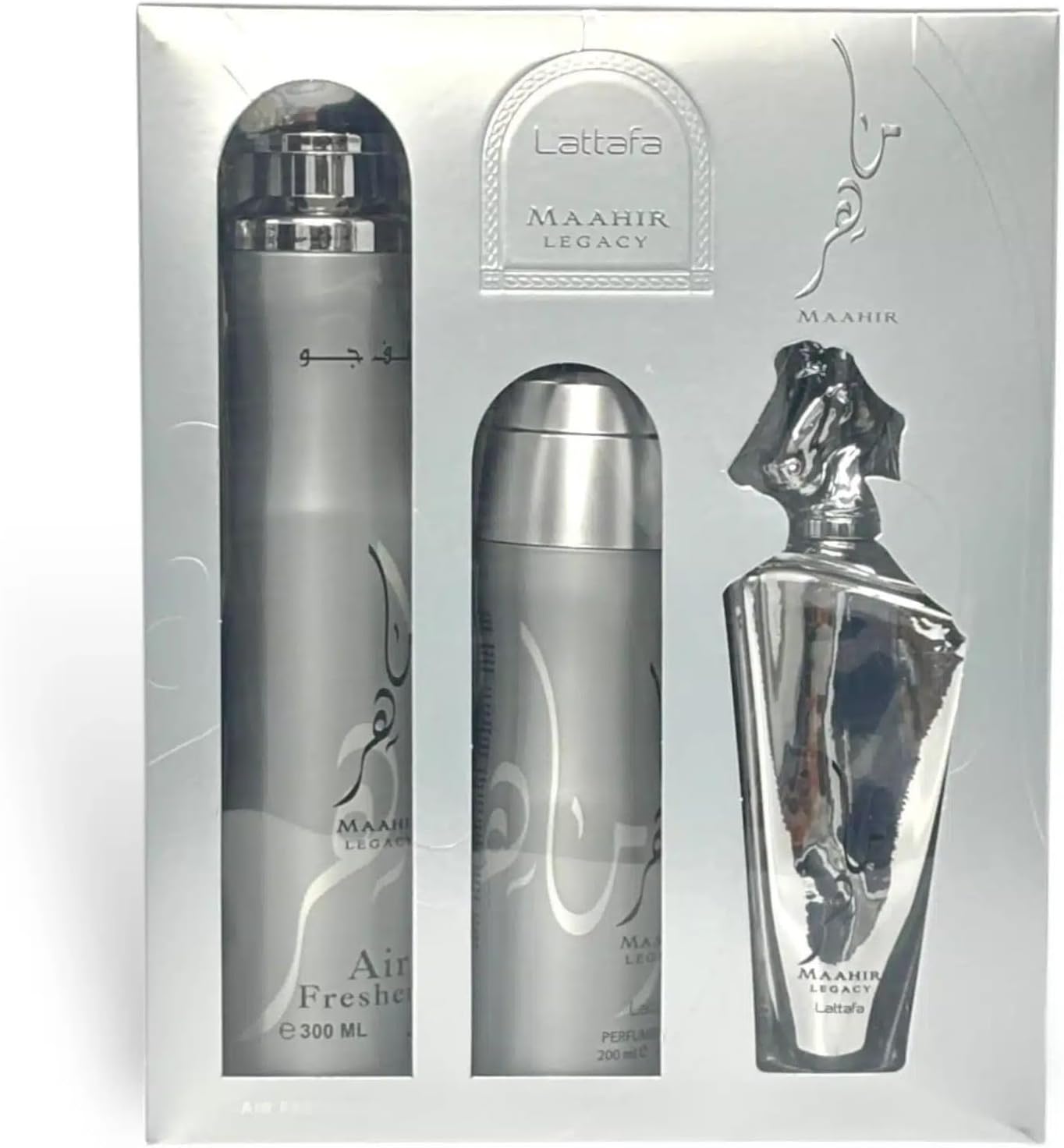 Lattafa Maahir Legacy For Men 3 Piece Gift Set (3.4 Fl Oz EDP + 6.67 Fl Oz Deo + 10.14 Fl Oz Air Freshener)