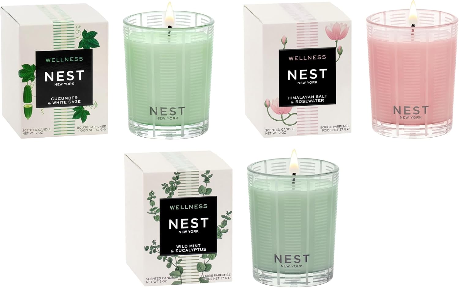 NEST New York Scented Votive Candle Wellness Bundle - Includes Cucumber & White Sage, Himalayan Salt & Rosewater, and Wild Mint & Eucalyptus - 2 oz Each