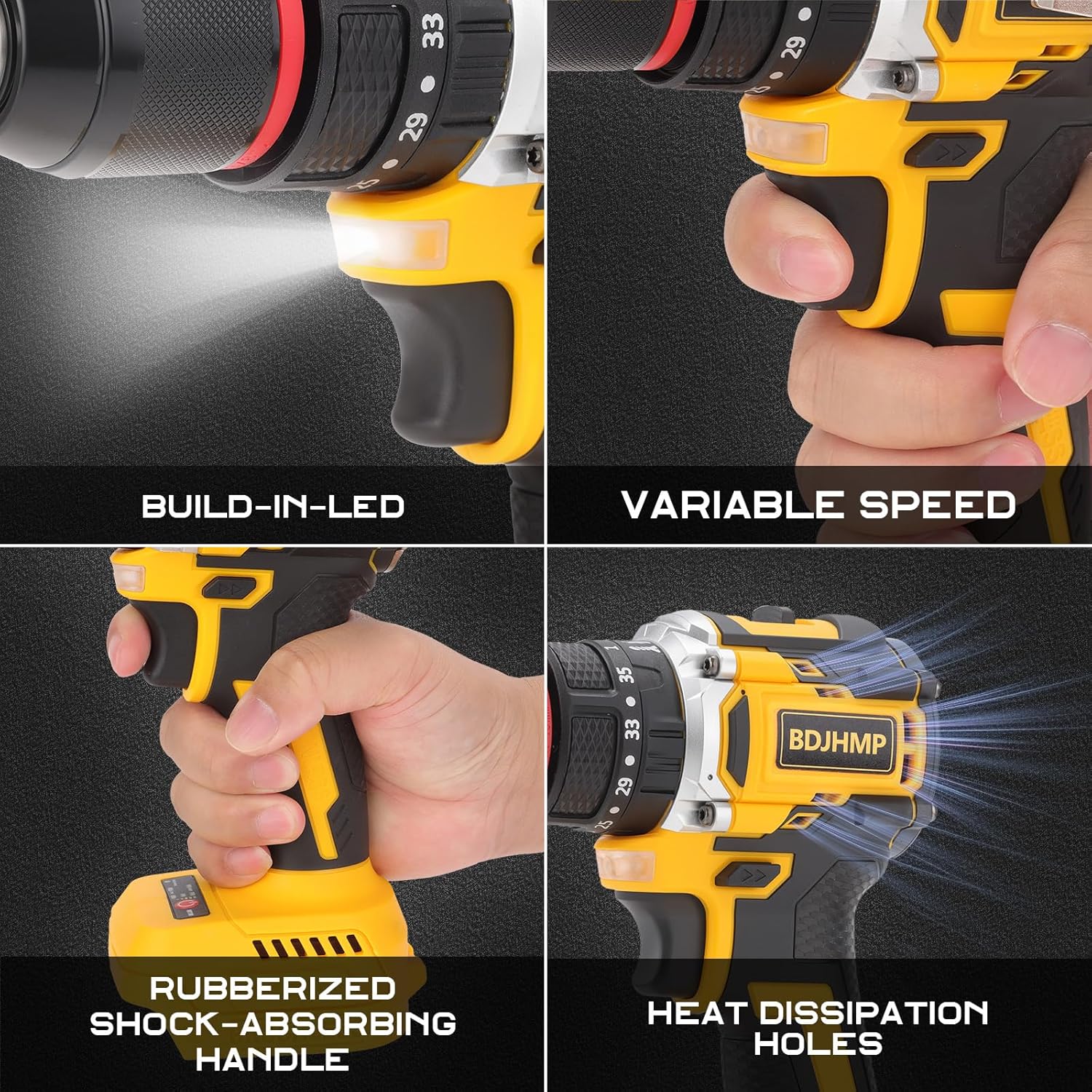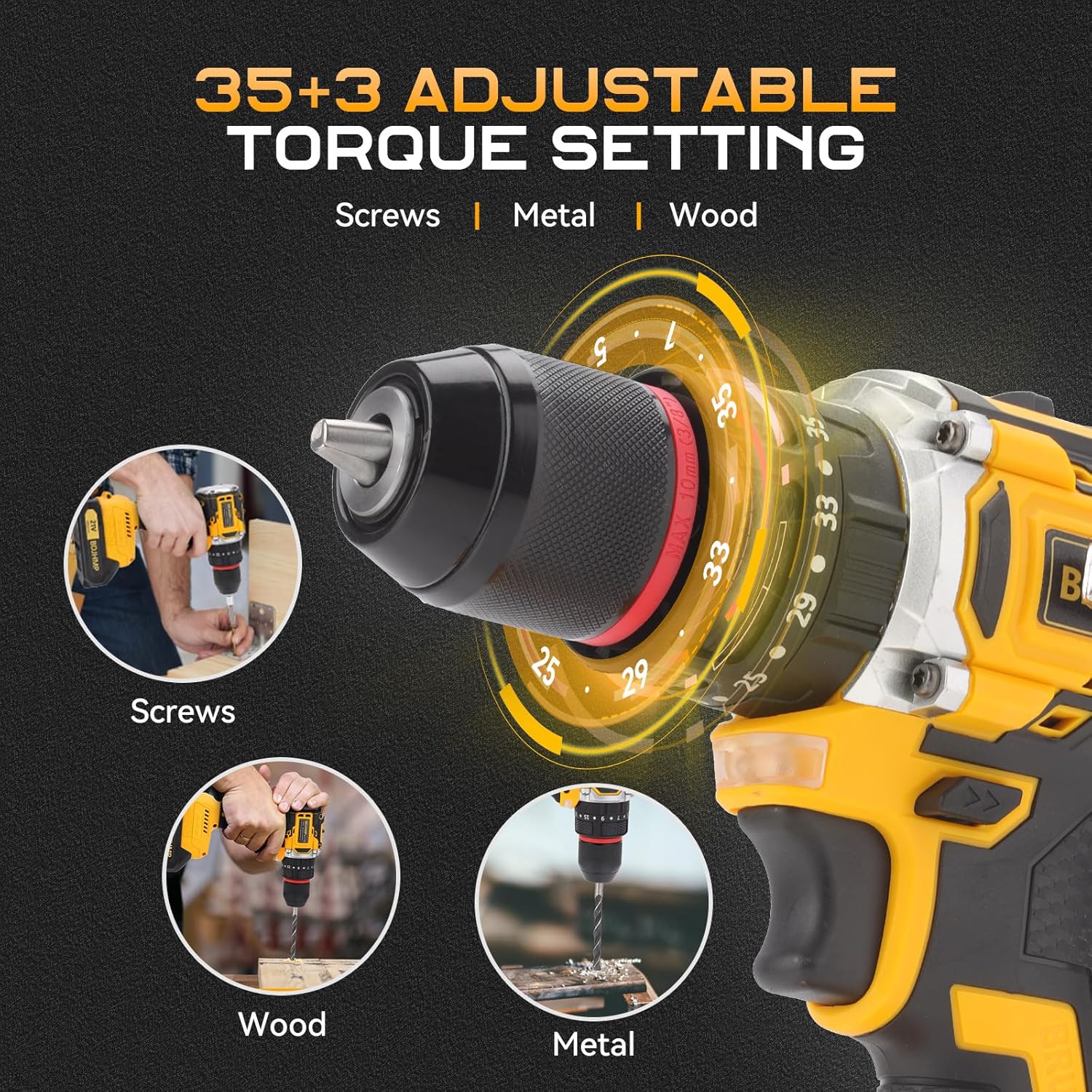 3/8” Keyless Metal Chuck & 35+3 Position Clutch : cordless drill set adopts metal keyless chuck, which is more stable than ordinary plastic chucks, screw head will not fall off, and the service life is higher than plastic chucks. 2 speed adjustments and 35 different gears adjustments, which can adjust the speed and torque according to the usage environment, Helps prevent the screw from sinking too deep, the screw head from falling off and even the screw shaft from breaking.