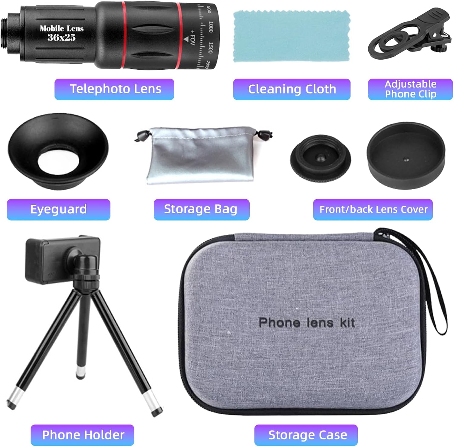 36X Telephoto Lens Kit Compatible with iPhone and Android, Long Focus Telephoto Phone Lens Magnification with Universal Clip and Tripod, Suitable for Most Smartphones Picture Video Taking