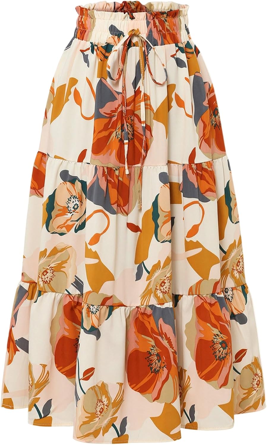 Womens Summer Casual A-Line Long Skirt Tiered High Waist Beach Outfits Elastic Waist Bohemian Print Maxi Skirt