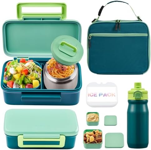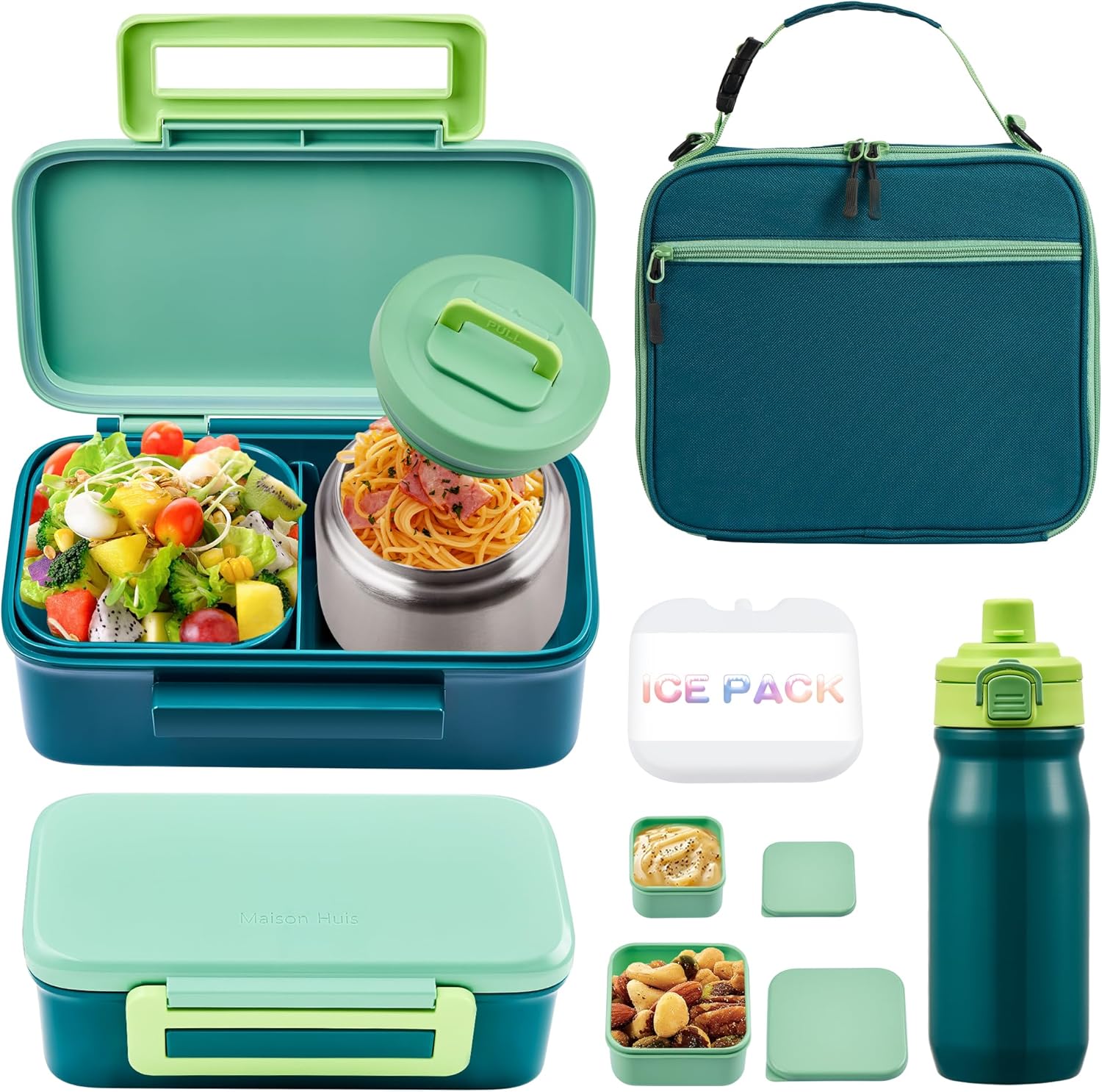 MAISON HUIS Bento Box for Kids with 8oz Soup Thermo, Insulated Lunch Bag & 17oz Water Bottle, 2-Compartment Bento Box with Built-In Ice Pack, Leak-Proof & BPA-Free (Green)