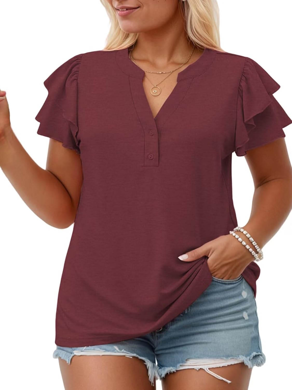 VISLILY Plus-Size-Summer-Tops for Women Cute Ruffle Short Sleeve T Shirts Notched V-Neck Tunics Button Down Blouses XL-5XL