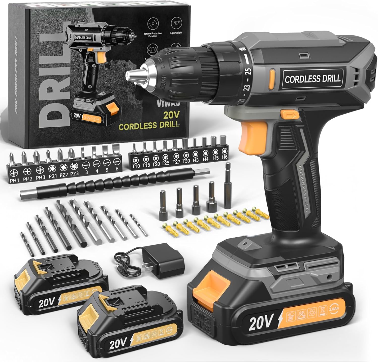Cordless Drill Set: The VIWKO 20V cordless drill is equipped with a high-performance motor and cordless design, allowing you to easily tackle everyday DIY projects! Whether it's assembling furniture, installing shelves, or other tasks, it's perfect for home repairs.