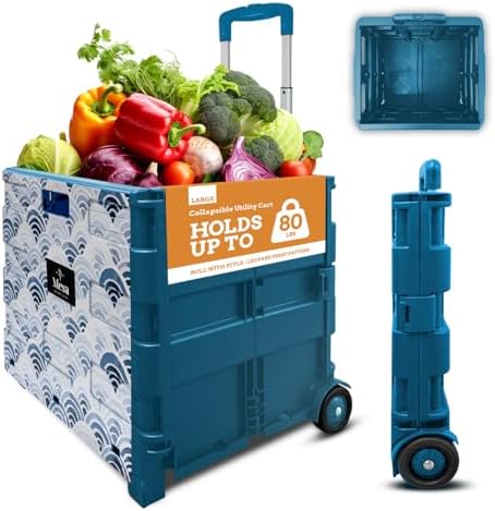 Inspired Living Ultra-Slim Rolling Collapsible Storage Pack-N-Roll Utility-carts, with Telescopic Handle, for Home, Garden, Shopping, Office, School use, Large, Blue, Wave Print