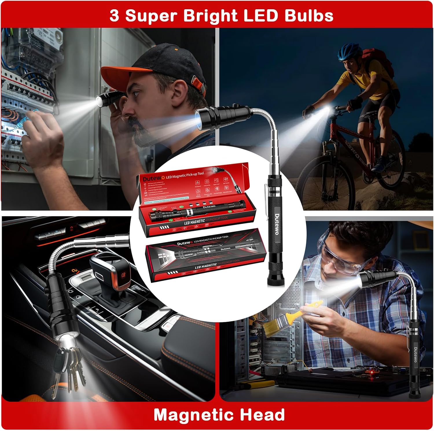 🎁【360°Illumination & Super Bright】Dutewo flexible magnetic pickup tool features 3 ultra-bright LED bulbs with an adjustable neck that freely rotates for full 360° illumination - perfect for locating and retrieving metal objects in dark corners and tight spaces.