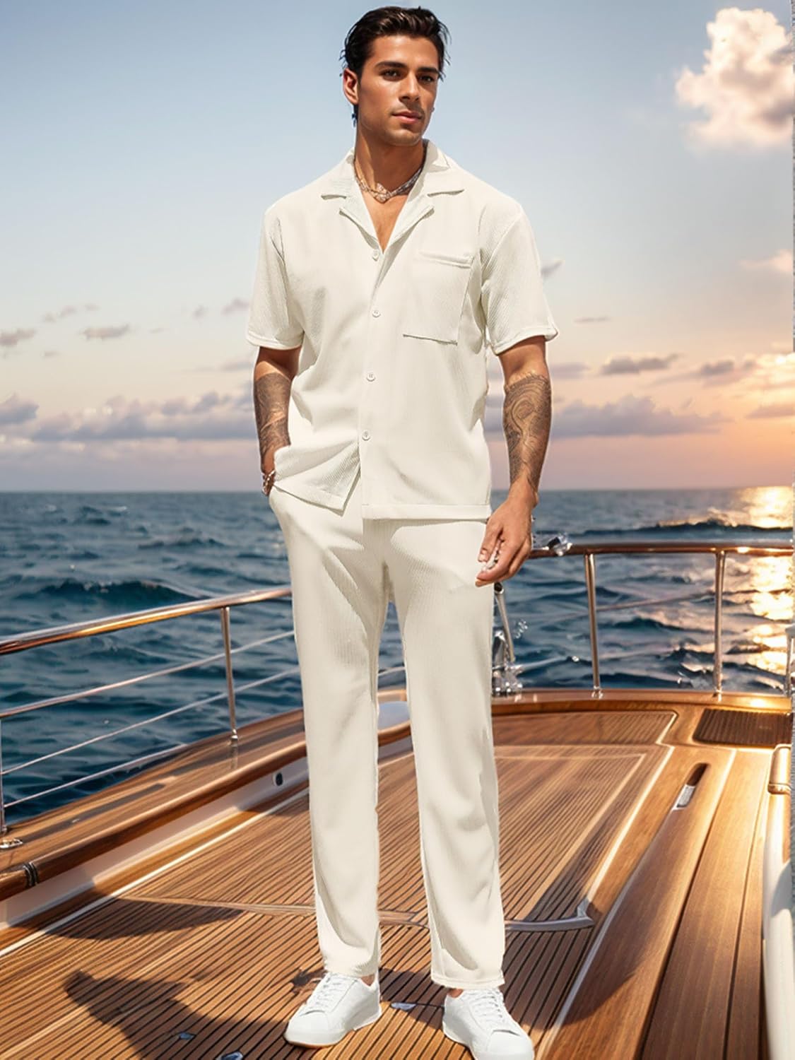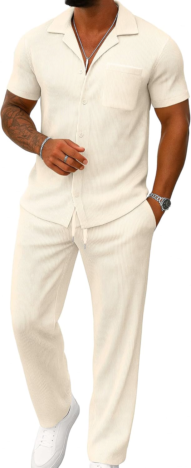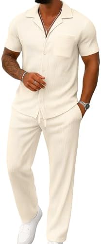 UOUA Mens Summer 2 Piece Set Casual Outfits Button Short Sleeve Shirt & Loose Pants Textured Striped Tracksuit Walking Suits