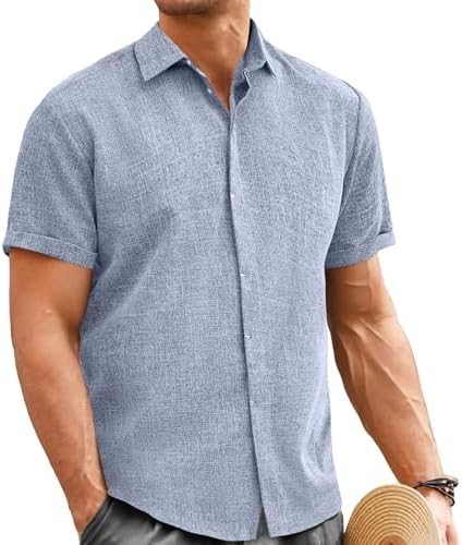 Mens Linen Shirt Classic Button Down Shirt Casual Short Sleeve Blouse Wedding Holiday Summer Tops Lightweight Tee