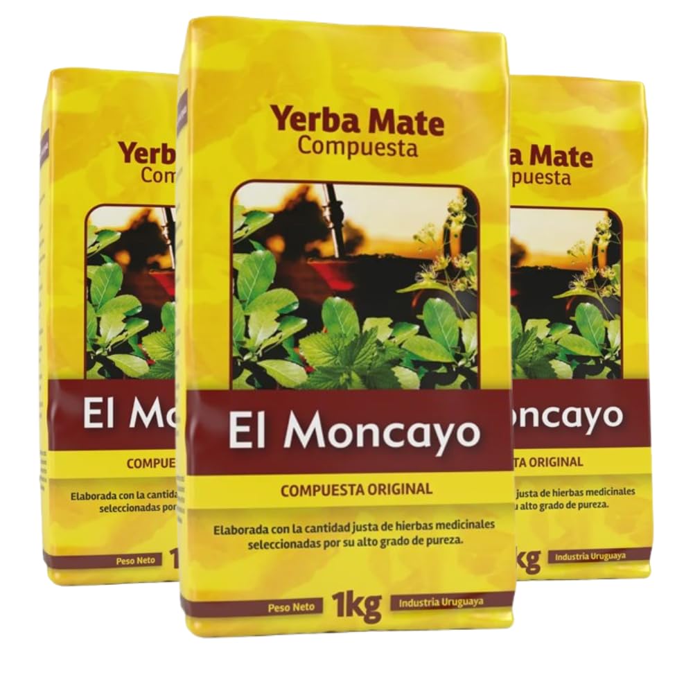 El Moncayo Yerba Mate Compuesta Original is a traditional Uruguayan yerba mate blend enriched with a selection of herbs for a unique and refreshing taste. Carefully crafted to enhance the natural benefits of yerba mate, this blend provides a balanced and smooth drinking experience, whether enjoyed hot or cold. Made with high-quality ingredients, it delivers an authentic South American taste and a natural source of energy. This pack includes three large 1 kg (2.2 lb) bags, perfect for daily consumption or sharing with family and friends.