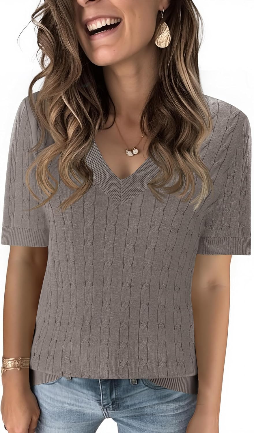 Kistore Womens Summer Short Sleeve Sweaters Tops V Neck Cable Knit Lightweight Sweater Shirts Blouses 2025