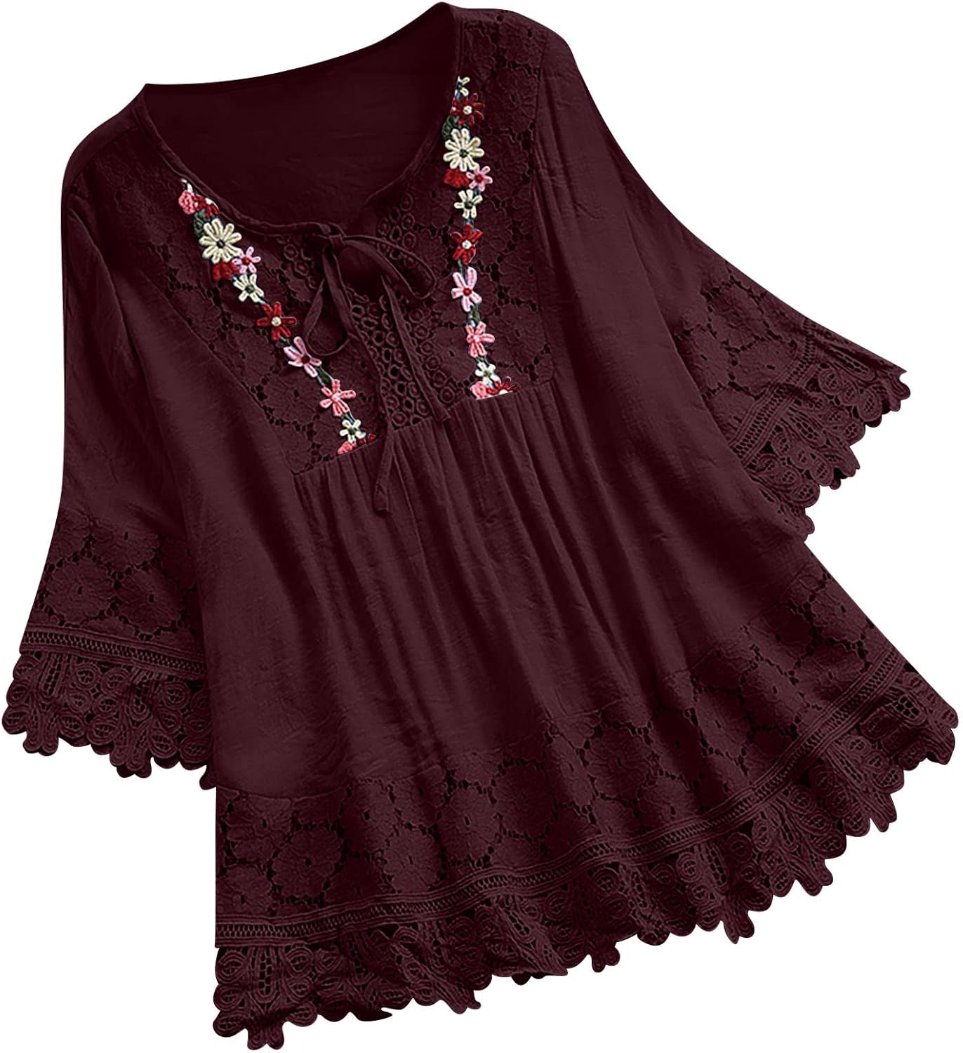 3/4 Length Sleeve Womens Boho Tops Cotton Linen Mexican Embroidered Shirts Plus Size Flowy Lace Tunic Peasant Blouses