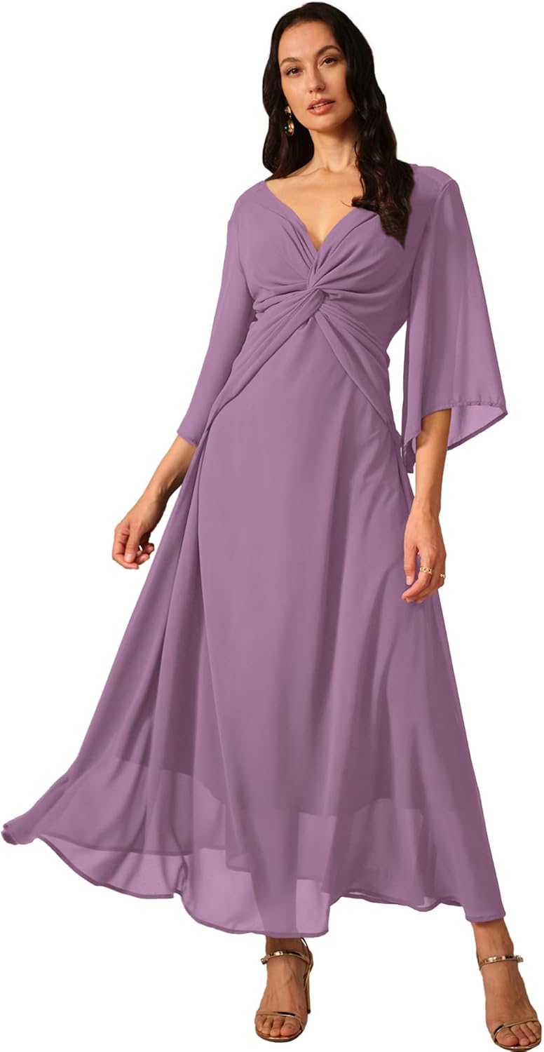 LUOFEN Women's Formal Cocktail Wedding Guest V Neck Long Chiffon Maxi Dresses A-Line 3/4 Sleeve Elegant Bridesmaids Dress