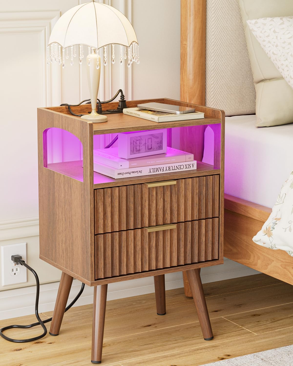Nightstand with Charging Station and LED Lights,Modern Bedside Table with 2Drawer and Open Shelf,Walnut Night Stand with Solid Wood Legs,End Table for Living Room、Bedroom and Small Spaces