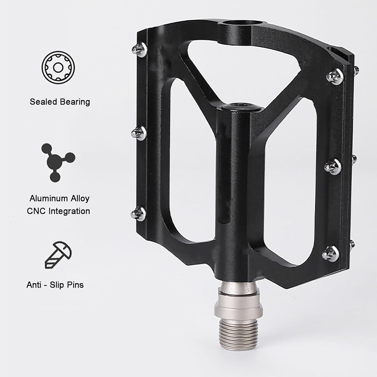 Anti-Skid Pin Design for Safety – The road bike pedals features 6 anti-slip pins on each side that offer superior traction and foot retention, ensuring confident pedaling even on rocky or uneven terrain—safe to ride even barefoot without discomfort or injury.